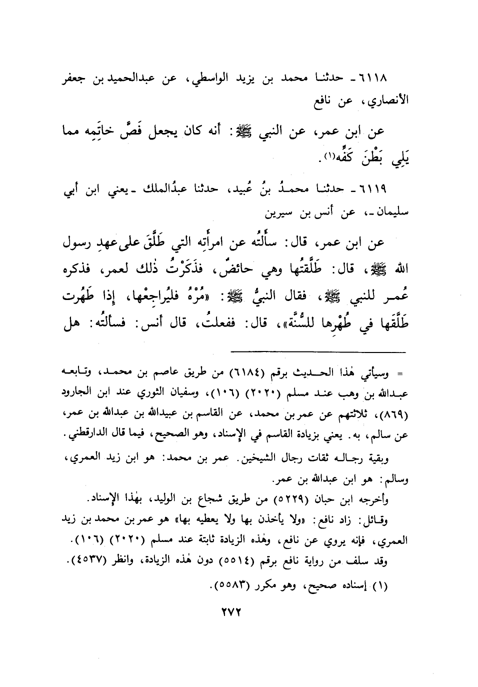 ٦١١٩ - حَدَّثَنَا مُحَمَّدُ بْنُ عُبَيْدٍ، حَدَّثَنَا عَبْدُ الْمَلِكِ يَعْنِي ابْنَ أَبِي سُلَيْمَانَ، عَنْ أَنَسِ بْنِ سِيرِينَ، عَنْ ابْنِ عُمَرَ قَالَ: سَأَلْتُهُ عَنِ امْرَأَتِهِ الَّتِي طَلَّقَ عَلَى عَهْدِ رَسُولِ اللهِ صَلَّى اللهُ عَلَيْهِ وَسَلَّمَ قَالَ: طَلَّقْتُهَا وَهِيَ حَائِضٌ، فَذَكَرْتُ ذَلِكَ لِعُمَرَ فَذَكَرَهُ عُمَرُ لِلنَّبِيِّ صَلَّى اللهُ عَلَيْهِ وَسَلَّمَ، فَقَالَ النَّبِيُّ صَلَّى اللهُ عَلَيْهِ وَسَلَّمَ: " مُرْهُ فَلْيُرَاجِعْهَا إِذَا طَهُرَتْ طَلَّقَهَا فِي طُهْرِهَا لِلسُّنَّةِ " قَالَ: فَفَعَلْتُ قَالَ أَنَسٌ: فَسَأَلْتُهُ: هَلِ