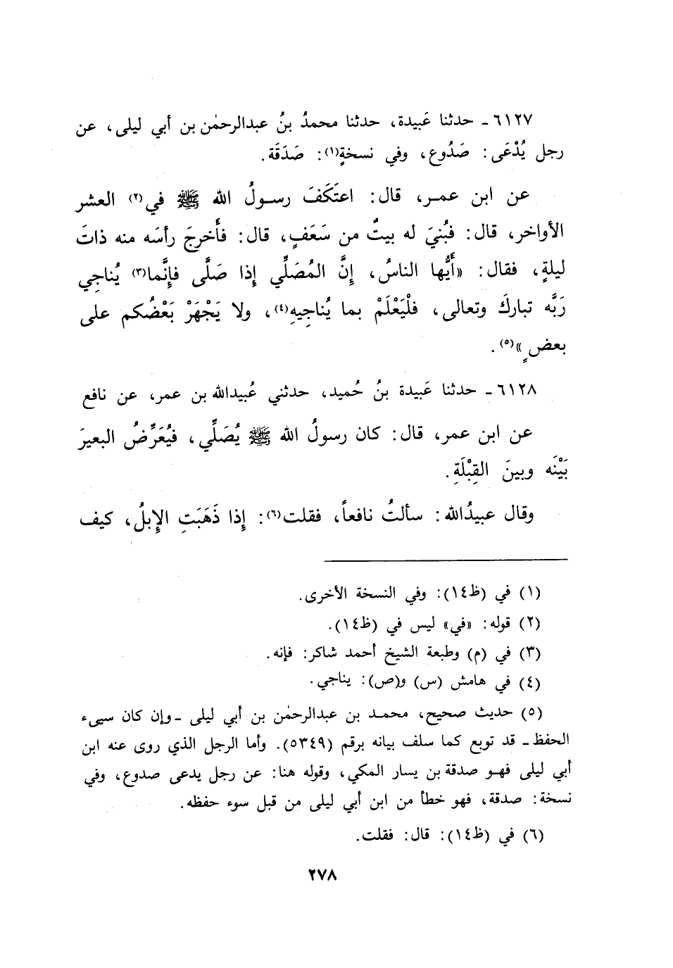 ٦١٢٧ - حَدَّثَنَا عَبِيدَةُ، حَدَّثَنَا مُحَمَّدُ بْنُ عَبْدِ الرَّحْمَنِ بْنِ أَبِي لَيْلَى، عَنْ رَجُلٍ يُدْعَى صَدُوعَ - وَفِي نُسْخَةٍ (١) صَدَقَةَ -، عَنِ ابْنِ عُمَرَ قَالَ: اعْتَكَفَ رَسُولُ اللهِ صَلَّى اللهُ عَلَيْهِ وَسَلَّمَ فِي الْعَشْرِ (٢) الْأَوَاخِرِ. قَالَ: فَبُنِيَ لَهُ بَيْتٌ مِنْ سَعَفٍ قَالَ: فَأَخْرَجَ رَأْسَهُ مِنْهُ ذَاتَ لَيْلَةٍ، فَقَالَ: " أَيُّهَا النَّاسُ، إِنَّ الْمُصَلِّيَ إِذَا صَلَّى فَإِنَّما (٣) يُنَاجِي رَبَّهُ تَبَارَكَ وَتَعَالَى، فَلْيَعْلَمْ بِمَا يُنَاجِيهِ (٤) ، وَلَا يَجْهَرْ بَعْضُكُمْ عَلَى بَعْضٍ " (٥)