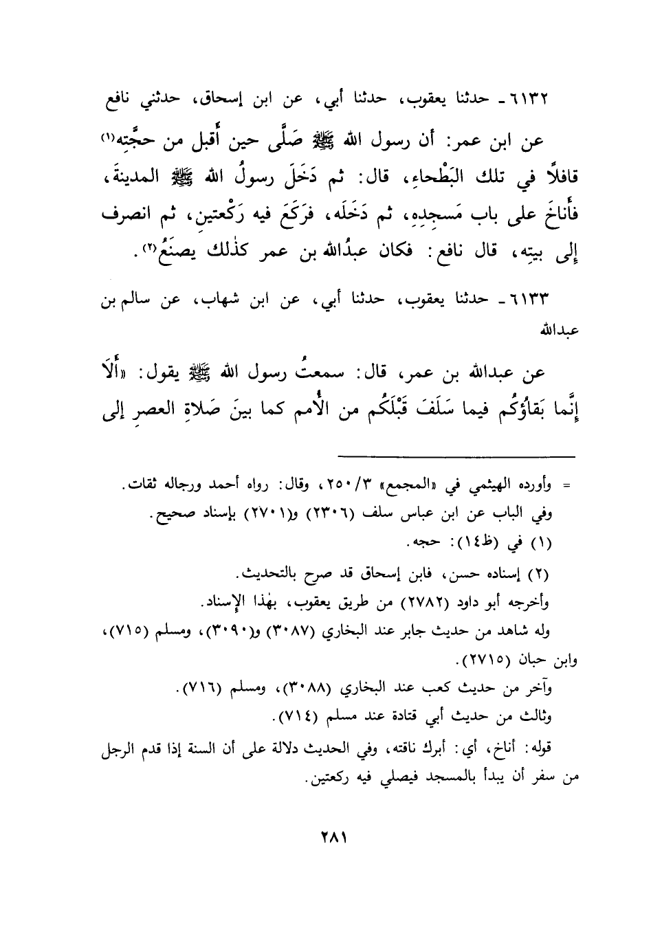 ٦١٣٢ - حَدَّثَنَا يَعْقُوبُ، حَدَّثَنَا أَبِي، عَنِ ابْنِ إِسْحَاقَ، حَدَّثَنِي نَافِعٌ، عَنِ ابْنِ عُمَرَ، " أَنَّ رَسُولَ اللهِ صَلَّى اللهُ عَلَيْهِ وَسَلَّمَ صَلَّى حِينَ أَقْبَلَ مِنْ حَجَّتِهِ (١) قَافِلًا فِي تِلْكَ الْبَطْحَاءِ " قَالَ: " ثُمَّ دَخَلَ رَسُولُ اللهِ صَلَّى اللهُ عَلَيْهِ وَسَلَّمَ الْمَدِينَةَ، فَأَنَاخَ عَلَى بَابِ مَسْجِدِهِ ثُمَّ دَخَلَهُ، فَرَكَعَ فِيهِ رَكْعَتَيْنِ، ثُمَّ انْصَرَفَ إِلَى بَيْتِهِ "، قَالَ نَافِعٌ فَكَانَ عَبْدُ اللهِ بْنُ عُمَرَ كَذَلِكَ يَصْنَعُ (٢)