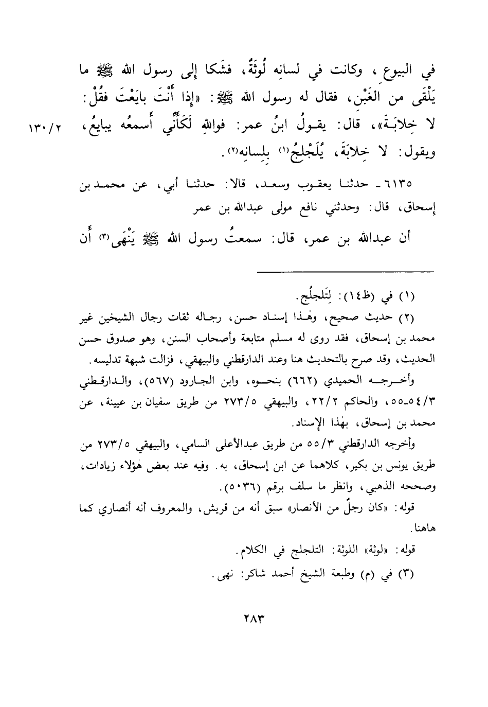 (٢) حديث صحيح، وهذا إسناد حسن، رجاله ثقات رجال الشيخين غير محمد بن إسحاق، فقد روى له مسلم متابعة وأصحاب السنن، وهو صدوق حسن الحديث، وقد صرح بالتحديث هنا وعند الدارقطني والبيهقي، فزالت شبهة تدليسه.