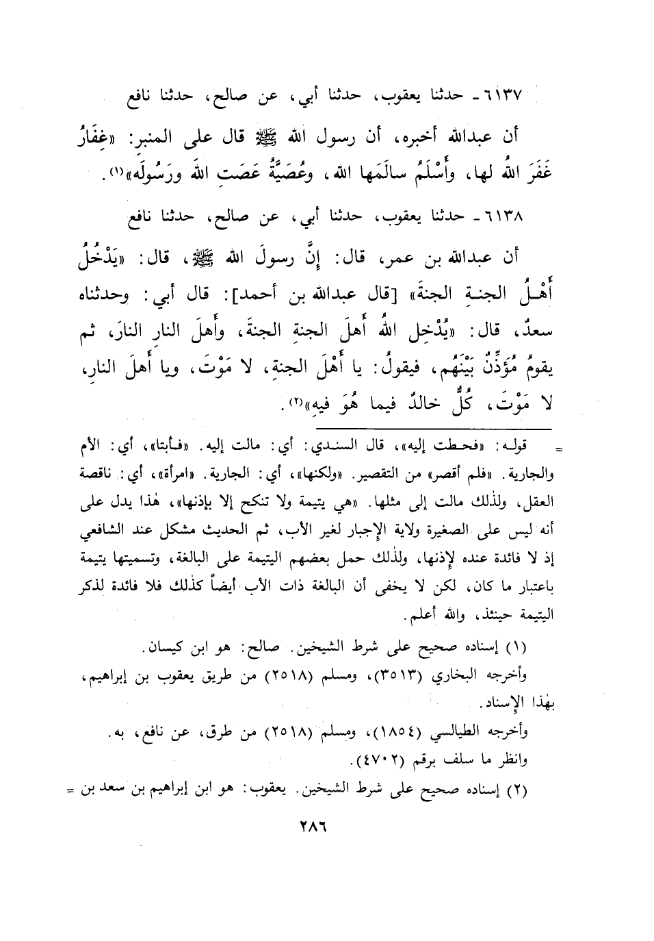 ٦١٣٨ - حَدَّثَنَا يَعْقُوبُ، حَدَّثَنَا أَبِي، عَنْ صَالِحٍ، حَدَّثَنَا نَافِعٌ، أَنَّ عَبْدَ اللهِ بْنَ عُمَرَ قَالَ: إِنَّ رَسُولَ اللهِ صَلَّى اللهُ عَلَيْهِ وَسَلَّمَ قَالَ: " يَدْخُلُ أَهْلُ الْجَنَّةِ الْجَنَّةَ "، قَالَ: عَبْدُ اللهِ بْنُ أَحْمَدَ: قَالَ أَبِي: وحَدَّثَنَاهُ سَعْدٌ قَالَ: " يُدْخِلُ اللهُ أَهْلَ الْجَنَّةِ الْجَنَّةَ، وَأَهْلَ النَّارِ النَّارَ، ثُمَّ يَقُومُ مُؤَذِّنٌ بَيْنَهُمْ فَيَقُولُ: يَا أَهْلَ الْجَنَّةِ لَا مَوْتَ، وَيَا أَهْلَ النَّارِ لَا مَوْتَ، كُلٌّ خَالِدٌ فِيمَا هُوَ فِيهِ " (٢)