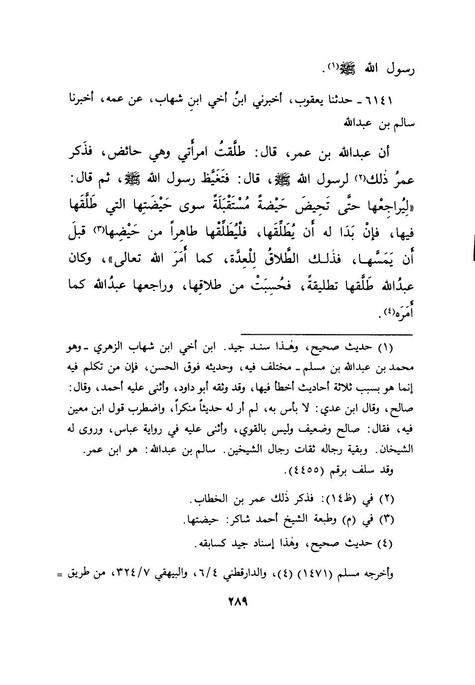 ٦١٤١ - حَدَّثَنَا يَعْقُوبُ، أَخْبَرَنِي ابْنُ أَخِي ابْنِ شِهَابٍ، عَنْ عَمِّهِ، أَخْبَرَنَا سَالِمُ بْنُ عَبْدِ اللهِ، أَنَّ عَبْدَ اللهِ بْنَ عُمَرَ قَالَ: طَلَّقْتُ امْرَأَتِي وَهِيَ حَائِضٌ، فَذَكَرَ عُمَرُ ذَلِكَ (٢) لِرَسُولِ اللهِ صَلَّى اللهُ عَلَيْهِ وَسَلَّمَ قَالَ: فَتَغَيَّظَ رَسُولُ اللهِ صَلَّى اللهُ عَلَيْهِ وَسَلَّمَ، ثُمَّ قَالَ: " لِيُرَاجِعْهَا حَتَّى تَحِيضَ حَيْضَةً مُسْتَقْبَلَةً سِوَى حَيْضَتِهَا الَّتِي طَلَّقَهَا فِيهَا، فَإِنْ بَدَا لَهُ أَنْ يُطَلِّقَهَا فَلْيُطَلِّقْهَا طَاهِرًا مِنْ حَيْضِهَا (٣) قَبْلَ أَنْ يَمَسَّهَا، فَذَلِكَ الطَّلَاقُ لِلْعِدَّةِ كَمَا أَمَرَ اللهُ تَعَالَى "، وَكَانَ عَبْدُ اللهِ طَلَّقَهَا تَطْلِيقَةً، فَحُسِبَتْ مِنْ طَلَاقِهَا وَرَاجَعَهَا عَبْدُ اللهِ كَمَا أَمَرَهُ (٤)