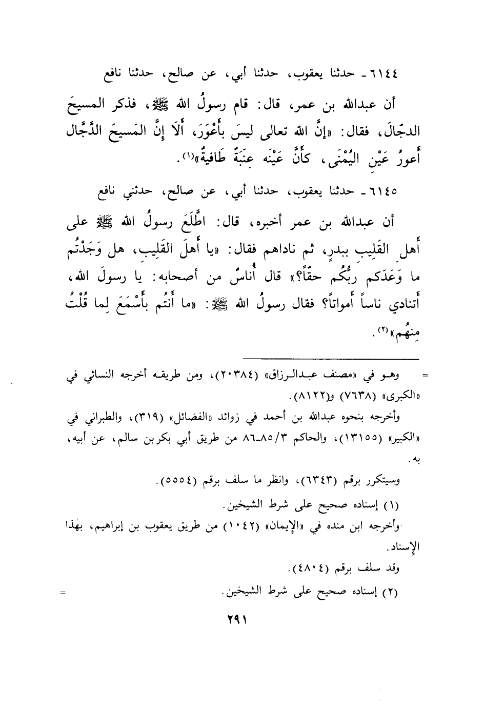 ٦١٤٤ - حَدَّثَنَا يَعْقُوبُ، حَدَّثَنَا أَبِي، عَنْ صَالِحٍ، حَدَّثَنَا نَافِعٌ، أَنَ عَبْدَ اللهِ بْنَ عُمَرَ قَالَ: قَامَ رَسُولُ اللهِ صَلَّى اللهُ عَلَيْهِ وَسَلَّمَ، فَذَكَرَ الْمَسِيحَ الدَّجَّالَ، فَقَالَ: " إِنَّ اللهَ تَعَالَى لَيْسَ بِأَعْوَرَ أَلَا إِنَّ الْمَسِيحَ الدَّجَّالَ أَعْوَرُ عَيْنِ الْيُمْنَى كَأَنَّ عَيْنَهُ عِنَبَةٌ طَافِيَةٌ " (١)