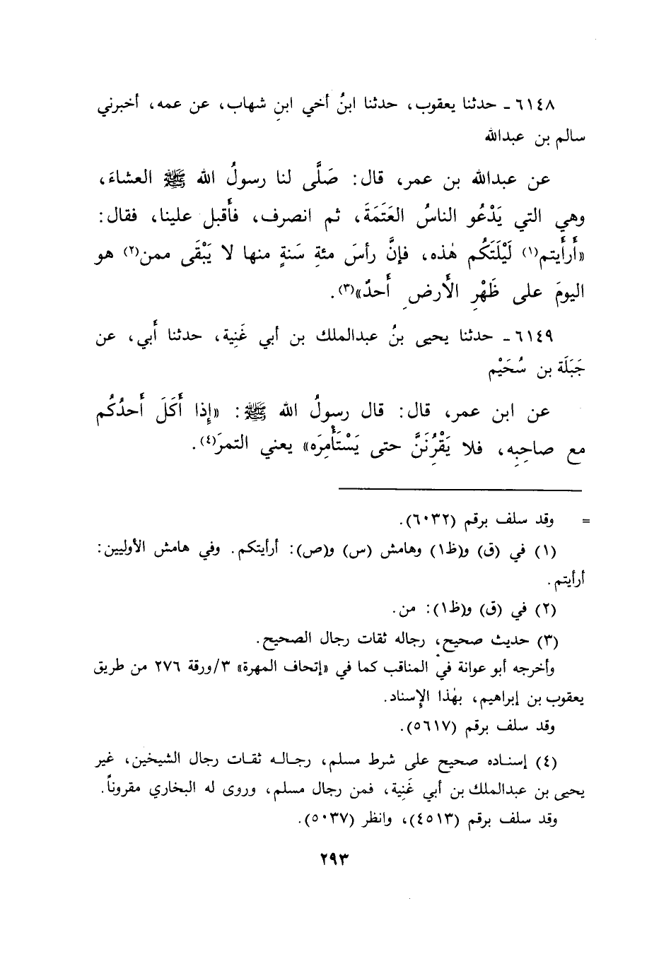 ٦١٤٨ - حَدَّثَنَا يَعْقُوبُ، حَدَّثَنَا ابْنُ أَخِي ابْنِ شِهَابٍ، عَنْ عَمِّهِ، أَخْبَرَنِي سَالِمُ بْنُ عَبْدِ اللهِ، عَنْ عَبْدِ اللهِ بْنِ عُمَرَ قَالَ: صَلَّى لَنَا رَسُولُ اللهِ صَلَّى اللهُ عَلَيْهِ وَسَلَّمَ الْعِشَاءَ، وَهِيَ الَّتِي يَدْعُو النَّاسُ الْعَتَمَةَ، ثُمَّ انْصَرَفَ فَأَقْبَلَ عَلَيْنَا، فَقَالَ: " أَرَأَيْتُمْ (١)