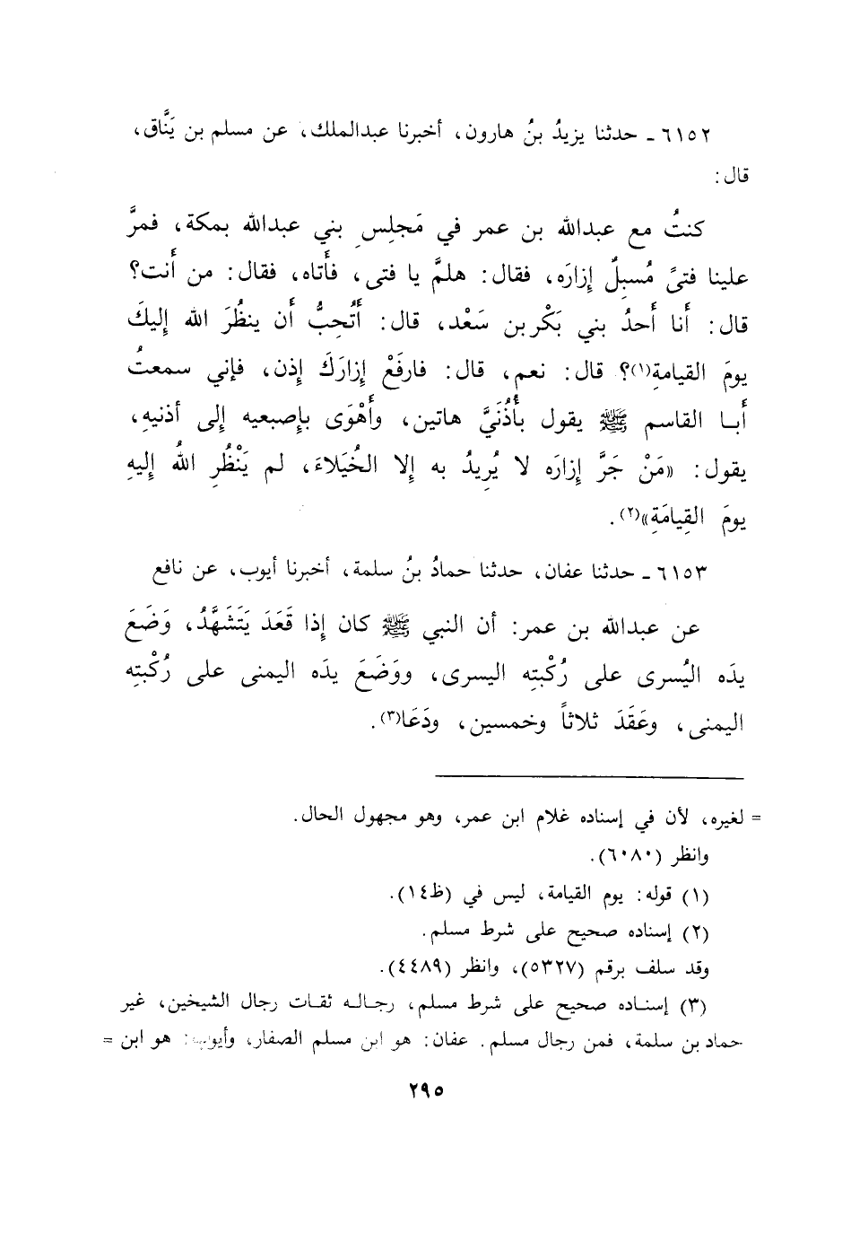 ٦١٥٢ - حَدَّثَنَا يَزِيدُ بْنُ هَارُونَ، أَخْبَرَنَا عَبْدُ الْمَلِكِ، عَنْ مُسْلِمِ بْنِ يَنَّاقَ قَالَ: كُنْتُ مَعَ عَبْدِ اللهِ بْنِ عُمَرَ فِي مَجْلِسِ بَنِي عَبْدِ اللهِ بِمَكَّةَ، فَمَرَّ عَلَيْنَا فَتًى مُسْبِلٌ إِزَارَهُ، فَقَالَ: هَلُمَّ يَا فَتَى، فَأَتَاهُ فَقَالَ: مَنْ أَنْتَ؟ قَالَ: أَنَا أَحَدُ بَنِي بَكْرِ بْنِ سَعْدٍ قَالَ: أَتُحِبُّ أَنْ يَنْظُرَ اللهُ إِلَيْكَ يَوْمَ الْقِيَامَةِ (١) ؟ قَالَ: نَعَمْ. قَالَ: فَارْفَعْ إِزَارَكَ إِذًا، فَإِنِّي سَمِعْتُ أَبَا الْقَاسِمِ صَلَّى اللهُ عَلَيْهِ وَسَلَّمَ يَقُولُ بِأُذُنَيَّ هَاتَيْنِ، وَأَهْوَى بِإِصْبَعَيْهِ إِلَى أُذُنَيْهِ يَقُولُ: " مَنْ جَرَّ إِزَارَهُ لَا يُرِيدُ بِهِ إِلَّا الْخُيَلَاءَ لَمْ يَنْظُرِ اللهُ إِلَيْهِ يَوْمَ الْقِيَامَةِ " (٢)