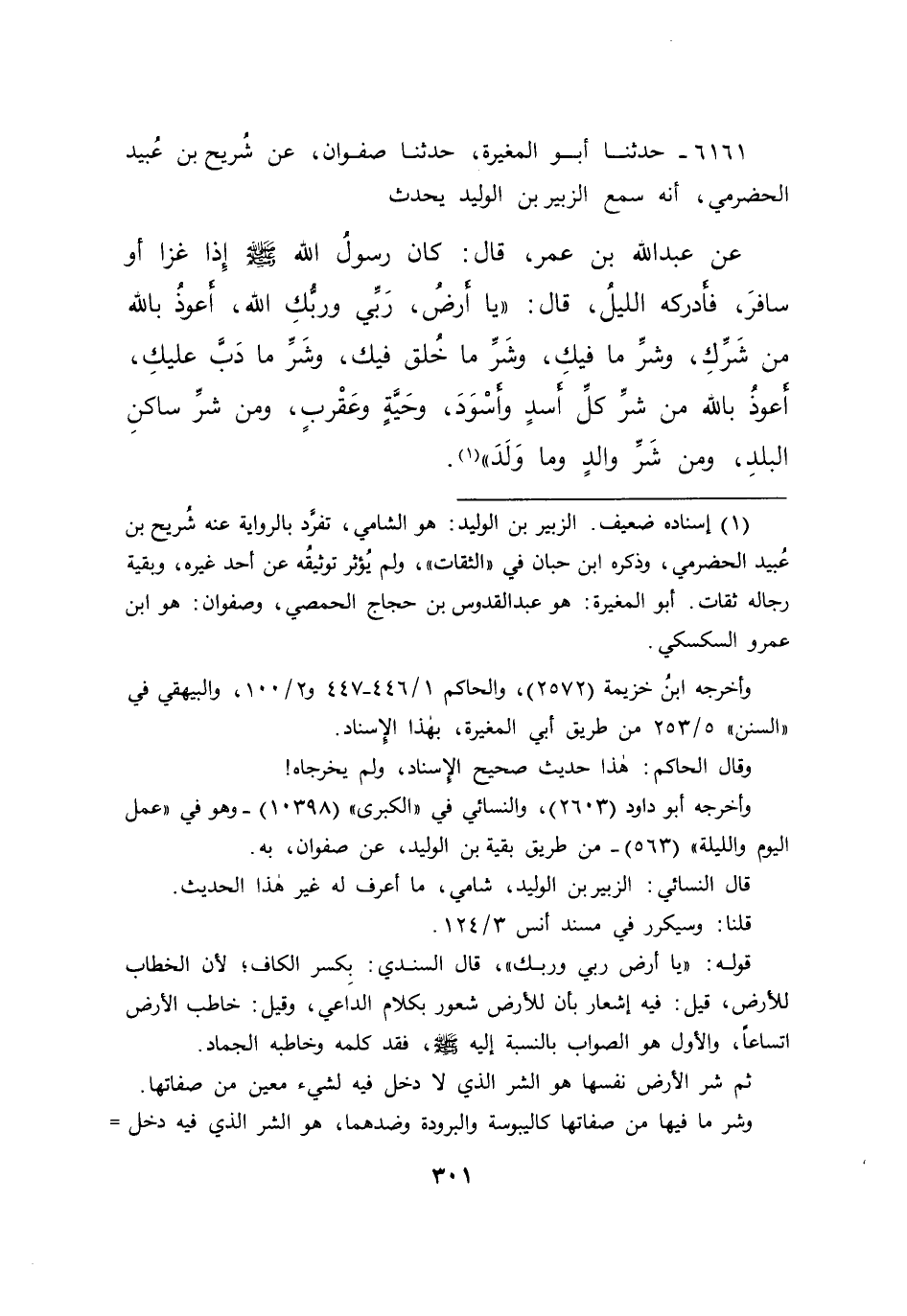 ٦١٦١ - حَدَّثَنَا أَبُو الْمُغِيرَةِ، حَدَّثَنَا صَفْوَانُ، عَنْ شُرَيْحِ بْنِ عُبَيْدٍ الْحَضْرَمِيِّ، أَنَّهُ سَمِعَ الزُّبَيْرَ بْنَ الْوَلِيدِ، يُحَدِّثُ عَنْ عَبْدِ اللهِ بْنِ عُمَرَ قَالَ: كَانَ رَسُولُ اللهِ صَلَّى اللهُ عَلَيْهِ وَسَلَّمَ إِذَا غَزَا أَوْ سَافَرَ، فَأَدْرَكَهُ اللَّيْلُ قَالَ: " يَا أَرْضُ رَبِّي وَرَبُّكِ اللهُ، أَعُوذُ بِاللهِ مِنْ شَرِّكِ، وَشَرِّ مَا فِيكِ، وَشَرِّ مَا خُلِقَ فِيكِ، وَشَرِّ مَا دَبَّ عَلَيْكِ، أَعُوذُ بِاللهِ مِنْ شَرِّ كُلِّ أَسَدٍ وَأَسْوَدَ، وَحَيَّةٍ، وَعَقْرَبٍ، وَمِنْ شَرِّ سَاكِنِ الْبَلَدِ، وَمِنْ شَرِّ وَالِدٍ وَمَا وَلَدَ " (١)