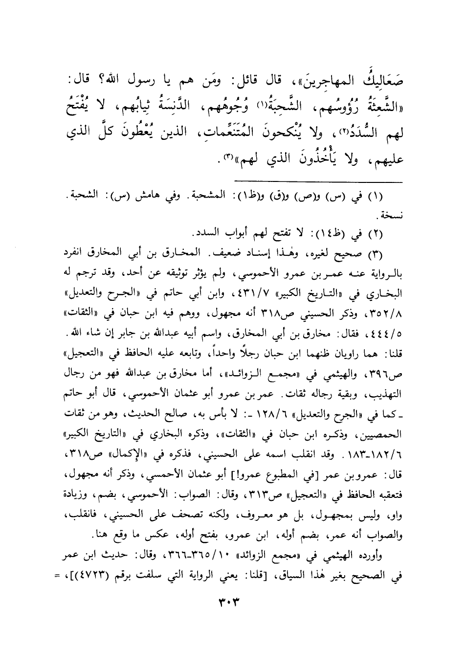 ٦/١٨٢-١٨٣. وقد انقلب اسمه على الحسيني، فذكره في"الِإكمال"، ص ٣١٨، قال: عمرو بن عمر [في المطبوع عمرو!] أبو عثمان الأحمسي، وذكر أنه مجهول، فتعقبه الحافظ في"التعجيل"، ص ٣١٣، وقال: الصواب: الأحموسي، بضم، وزيادة واو، وليس بمجهول، بل هو معروف، ولكنه تصحف على الحسيني، فانقلب، والصواب أنه عمر، بضم أوله، ابن عمرو، بفتح أوله، عكس ما وقع هنا.