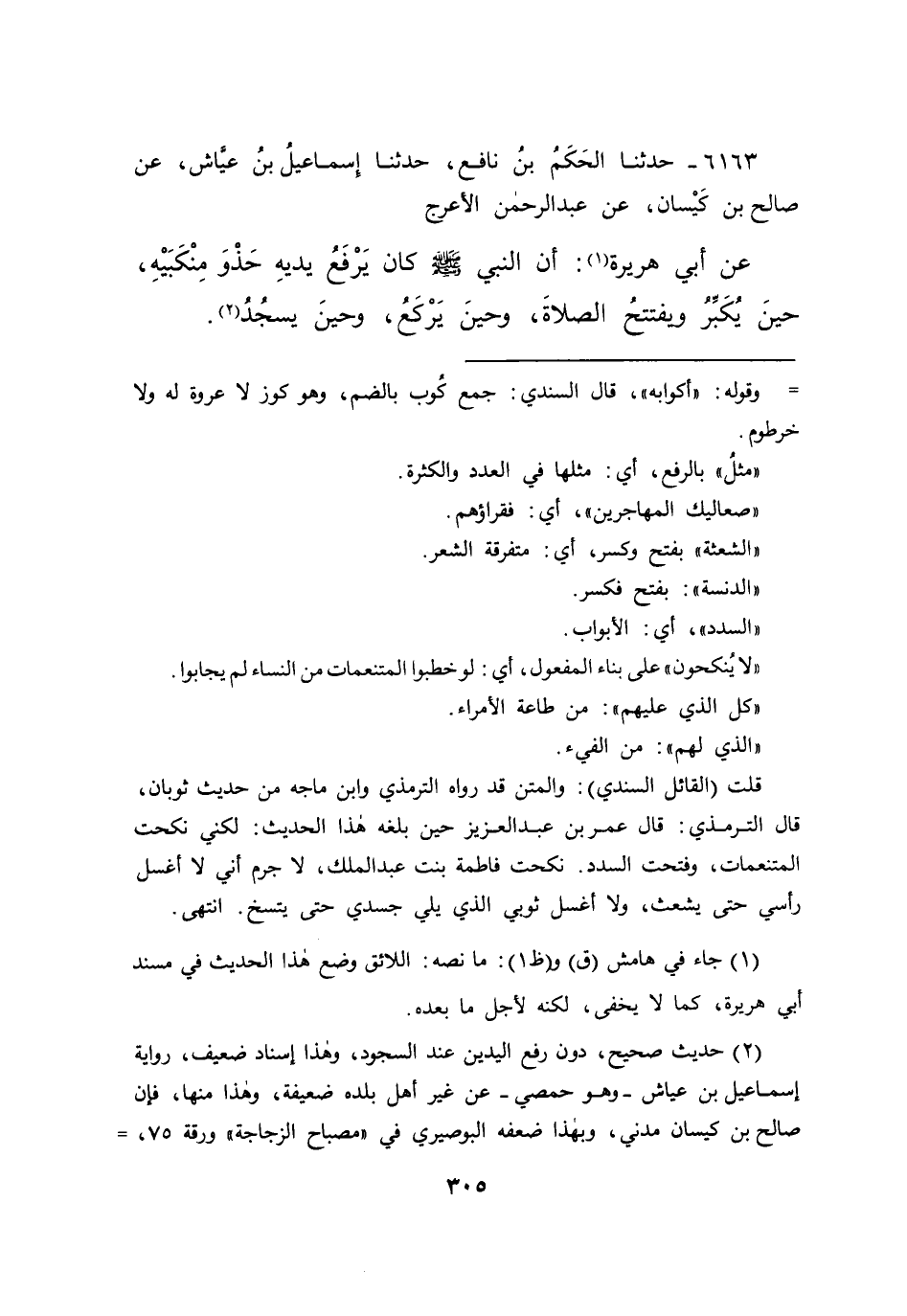 قلت (القائل السندي) : والمتن قد رواه الترمذي وابن ماجه من حديث ثوبان، قال الترمذي: قال عمر بن عبد العزيز حين بلغه هذا الحديث: لكني نكحت المتنعمات، وفتحت السدد. نكحت فاطمة بنت عبد الملك، لا جرم أني لا أغسل رأسي حتى يشعث، ولا أغسل ثوبي الذي يلي جسدي حتى يتسخ. انتهى.