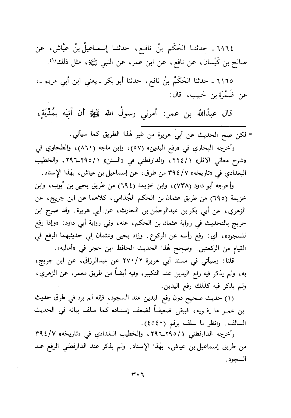 ٦١٦٤ - حَدَّثَنَا الْحَكَمُ بْنُ نَافِعٍ، حَدَّثَنَا إِسْمَاعِيلُ بْنُ عَيَّاشٍ، عَنْ صَالِحِ بْنِ كَيْسَانَ، عَنْ نَافِعٍ، عَنِ ابْنِ عُمَرَ، عَنِ النَّبِيِّ صَلَّى اللهُ عَلَيْهِ وَسَلَّمَ مِثْلَ ذَلِكَ (١)