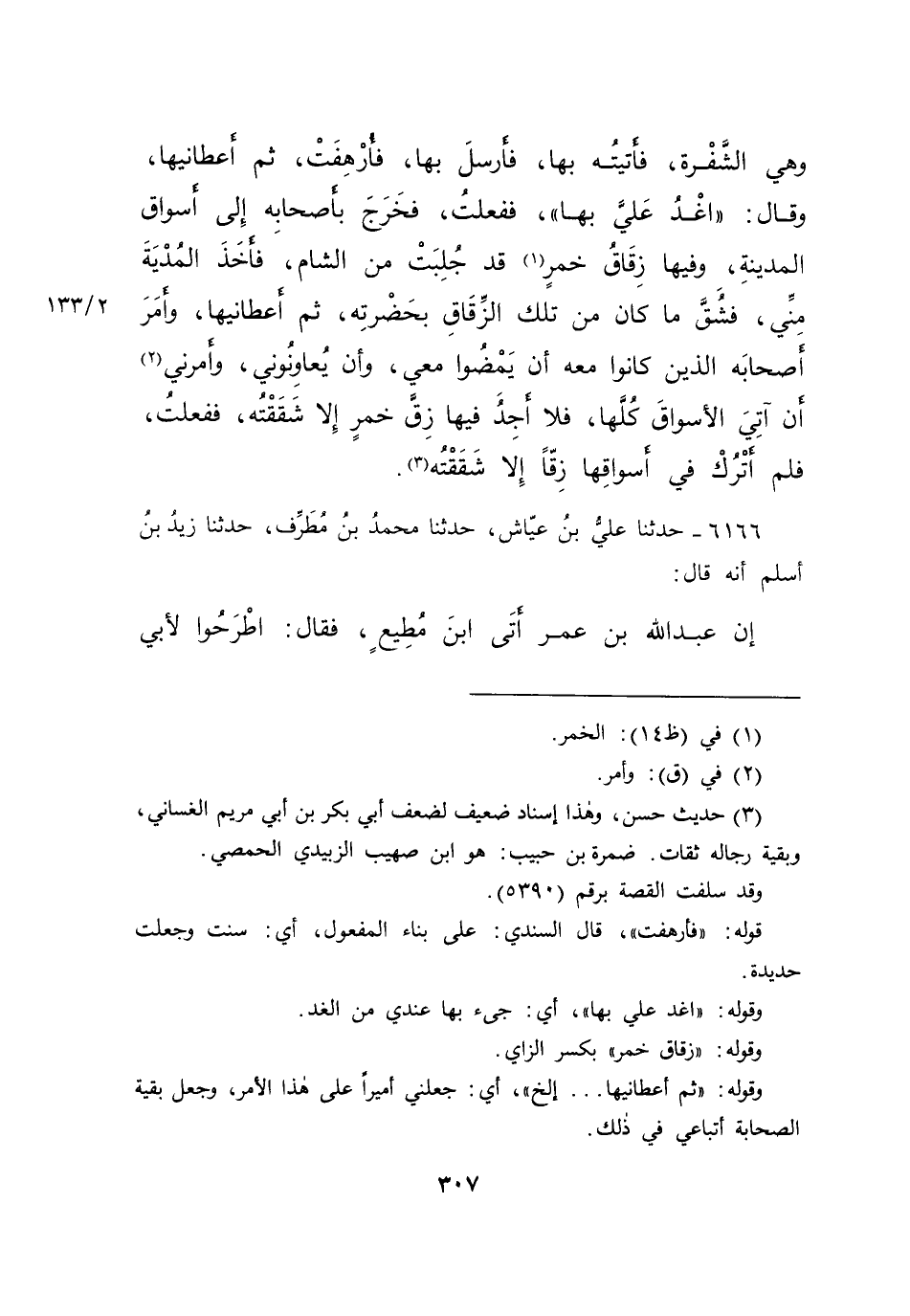 وَهِيَ الشَّفْرَةُ - فَأَتَيْتُهُ بِهَا، فَأَرْسَلَ بِهَا، فَأُرْهِفَتْ، ثُمَّ أَعْطَانِيهَا وَقَالَ: " اغْدُ عَلَيَّ بِهَا "، فَفَعَلْتُ، فَخَرَجَ بِأَصْحَابِهِ إِلَى أَسْوَاقِ الْمَدِينَةِ، وَفِيهَا زِقَاقُ خَمْرٍ (١) قَدْ جُلِبَتْ مِنَ الشَّامِ، فَأَخَذَ الْمُدْيَةَ مِنِّي، فَشَقَّ مَا كَانَ مِنْ تِلْكَ الزِّقَاقِ بِحَضْرَتِهِ، ثُمَّ أَعْطَانِيهَا، وَأَمَرَ أَصْحَابَهُ الَّذِينَ كَانُوا مَعَهُ أَنْ يَمْضُوا مَعِي، وَأَنْ يُعَاوِنُونِي، وَأَمَرَنِي (٢) أَنْ آتِيَ الْأَسْوَاقَ كُلَّهَا، فَلَا أَجِدُ فِيهَا زِقَّ خَمْرٍ إِلَّا شَقَقْتُهُ، فَفَعَلْتُ فَلَمْ أَتْرُكْ فِي أَسْوَاقِهَا زِقًّا إِلَّا شَقَقْتُهُ (٣)