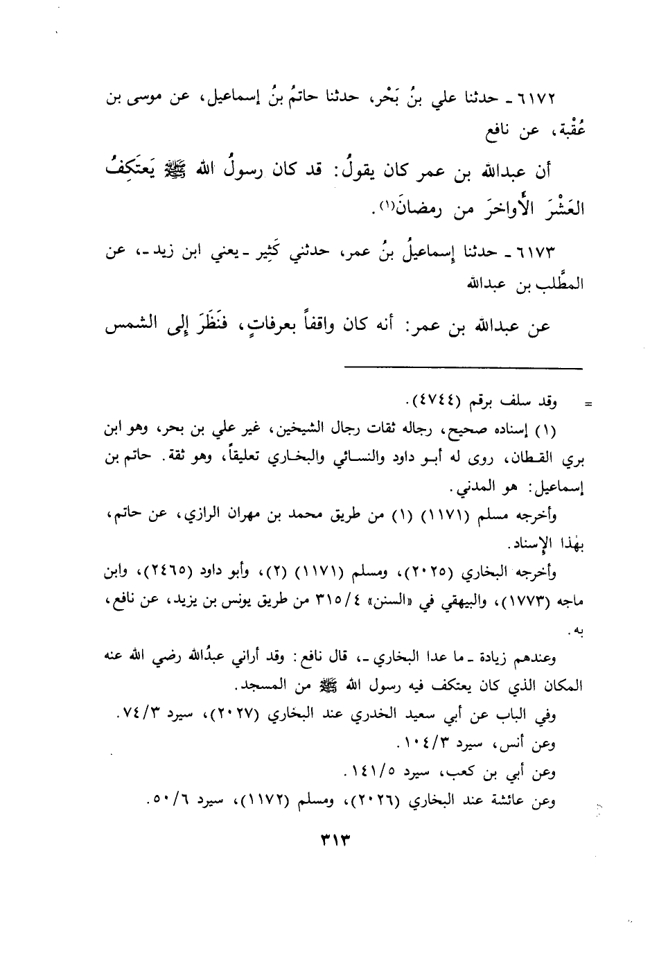 ٦١٧٢ - حَدَّثَنَا عَلِيُّ بْنُ بَحْرٍ، حَدَّثَنَا حَاتِمُ بْنُ إِسْمَاعِيلَ، عَنْ مُوسَى بْنِ عُقْبَةَ، عَنْ نَافِعٍ، أَنَّ عَبْدَ اللهِ بْنَ عُمَرَ، كَانَ يَقُولُ: " قَدْ كَانَ رَسُولُ اللهِ صَلَّى اللهُ عَلَيْهِ وَسَلَّمَ يَعْتَكِفُ الْعَشْرَ الْأَوَاخِرَ مِنْ رَمَضَانَ " (١)