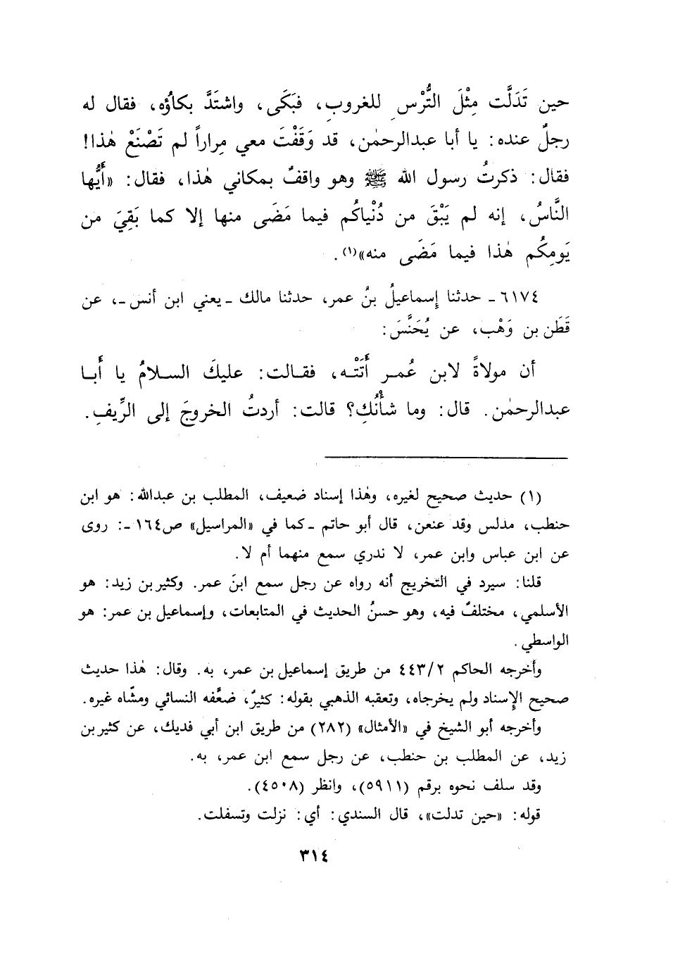 ٦١٧٤ - حَدَّثَنَا إِسْمَاعِيلُ بْنُ عُمَرَ، حَدَّثَنَا مَالِكٌ يَعْنِي ابْنَ أَنَسٍ، عَنْ قَطَنِ بْنِ وَهْبٍ، عَنْ يُحَنَّسَ، أَنَّ مَوْلَاةً لِابْنِ عُمَرَ أَتَتْهُ فَقَالَتْ: عَلَيْكَ السَّلَامُ يَا أَبَا عَبْدِ الرَّحْمَنِ قَالَ: وَمَا شَأْنُكِ؟ قَالَتْ: أَرَدْتُ الْخُرُوجَ إِلَى الرِّيفِ،