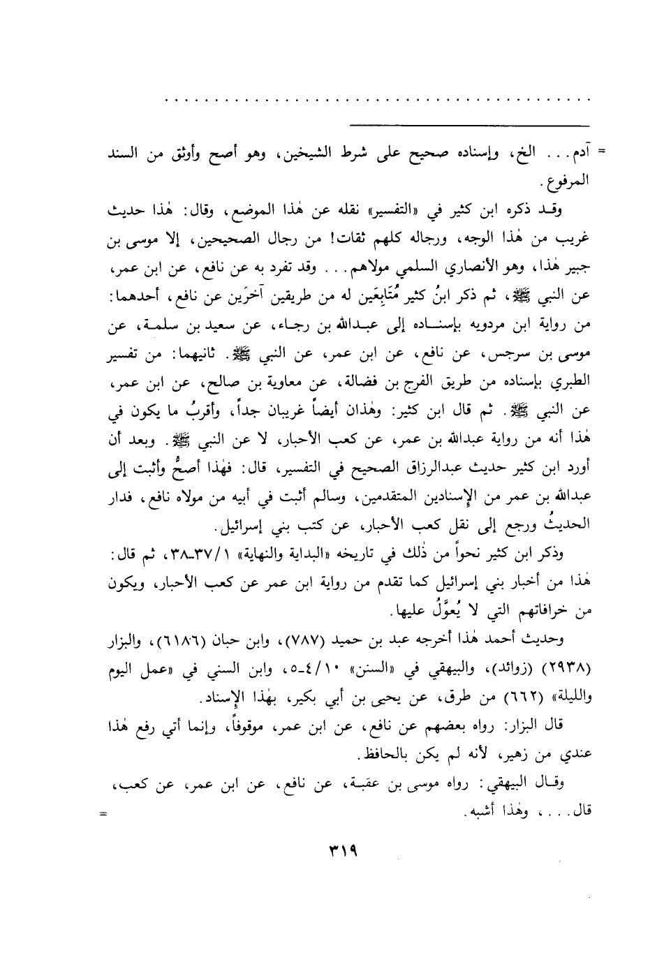 وقد ذكره ابن كثير في "التفسير" نقله عن هذا الموضع، وقال: هذا حديث غريب من هذا الوجه، ورجاله كلهم ثقات! من رجال الصحيحين، إلا موسى بن جبير هذا، وهو الأنصاري السلمي مولاهم ... وقد تفرد به عن نافع، عن ابن عمر، عن النبي صَلَّى اللهُ عَلَيْهِ وَسَلَّمَ، ثم ذكر ابنُ كثير مُتَابِعَين له من طريقين آخرَين عن نافع، أحدهما: من رواية ابن مردويه بإسناده إلى عبد الله بن رجاء، عن سعيد بن سلمة، عن موسى بن سرجس، عن نافع، عن ابن عمر، عن النبي صَلَّى اللهُ عَلَيْهِ وَسَلَّمَ. ثانيهما: من تفسير الطبري بإسناده من طريق الفرج بن فضالة، عن معاوية بن صالح، عن ابن عمر، عن النبي صَلَّى اللهُ عَلَيْهِ وَسَلَّمَ. ثم قال ابن كثير: وهذان أيضاً غريبان جداً، وأقربُ ما يكون في هذا أنه من رواية عبد الله بن عمر، عن كعب الأحبار، لا عن النبي صلى الله علية وسلم. وبعد أن أورد ابن كثير حديث عبد الرزاق الصحيح في التفسير، قال: فهذا أصحُ وأثبت إلى عبد الله بن عمر من الِإسنادين المتقدمين، وسالم أثبت في إبيه من مولاه نافع، فدار الحديث ورجع إلى نقل كعب الأحبار، عن كتب بني إسرائيل.