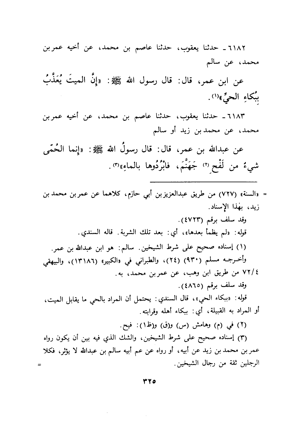 ٦١٨٢ - حَدَّثَنَا يَعْقُوبُ، حَدَّثَنَا عَاصِمُ بْنُ مُحَمَّدٍ، عَنْ أَخِيهِ عُمَرَ بْنِ مُحَمَّدٍ، عَنْ سَالِمٍ، عَنِ ابْنِ عُمَرَ قَالَ: قَالَ رَسُولُ اللهِ صَلَّى اللهُ عَلَيْهِ وَسَلَّمَ: " إِنَّ الْمَيِّتَ يُعَذَّبُ بِبُكَاءِ الْحَيِّ " (١)