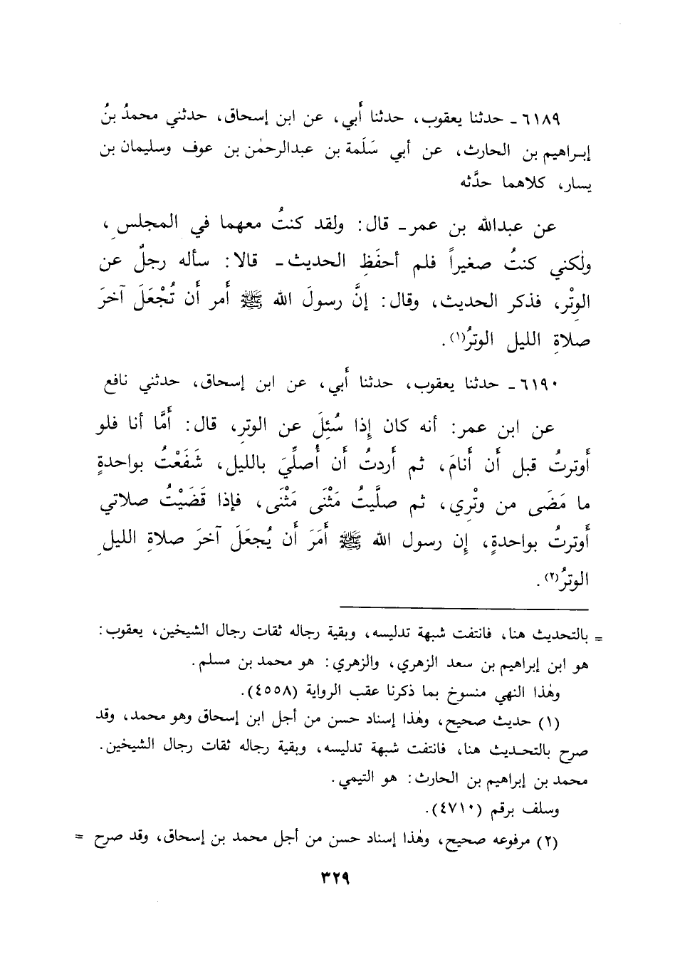 ٦١٨٩ - حَدَّثَنَا يَعْقُوبُ، حَدَّثَنَا أَبِي، عَنْ ابْنِ إِسْحَاقَ، حَدَّثَنِي مُحَمَّدُ بْنُ إِبْرَاهِيمَ بْنِ الْحَارِثِ، عَنْ أَبِي سَلَمَةَ بْنِ عَبْدِ الرَّحْمَنِ بْنِ عَوْفٍ، وَسُلَيْمَانَ بْنِ يَسَارٍ، كِلَاهُمَا حَدَّثَهُ، عَنْ عَبْدِ اللهِ بْنِ عُمَرَ قَالَ: وَلَقَدْ كُنْتُ مَعَهُمَا فِي الْمَجْلِسِ، وَلَكِنِّي كُنْتُ صَغِيرًا، فَلَمْ أَحْفَظِ الْحَدِيثَ، قَالَا: سَأَلَهُ رَجُلٌ عَنِ الْوِتْرُ، فَذَكَرَ الْحَدِيثَ، وَقَالَ: " إِنَّ رَسُولَ اللهِ صَلَّى اللهُ عَلَيْهِ وَسَلَّمَ أَمَرَ أَنْ تُجْعَلَ آخِرَ صَلَاةِ اللَّيْلِ الْوَتْرُ " (١)
