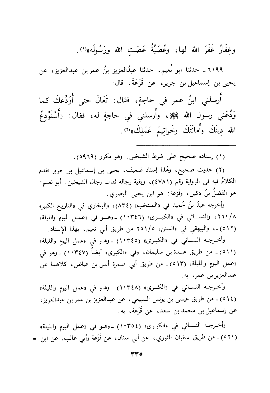 ٦١٩٩ - حَدَّثَنَا أَبُو نُعَيْمٍ، حَدَّثَنَا عَبْدُ الْعَزِيزِ بْنُ عُمَرَ بْنِ عَبْدِ الْعَزِيزِ، عَنْ يَحْيَى بْنِ إِسْمَاعِيلَ بْنِ جَرِيرٍ، عَنْ قَزَعَةَ قَالَ: أَرْسَلَنِي ابْنُ عُمَرَ فِي حَاجَةٍ فَقَالَ: تَعَالَ حَتَّى أُوَدِّعَكَ كَمَا وَدَّعَنِي رَسُولُ اللهِ صَلَّى اللهُ عَلَيْهِ وَسَلَّمَ، وَأَرْسَلَنِي فِي حَاجَةٍ لَهُ، فَقَالَ: " أَسْتَوْدِعُ اللهَ دِينَكَ، وَأَمَانَتَكَ، وَخَوَاتِيمَ عَمَلِكَ " (٢)