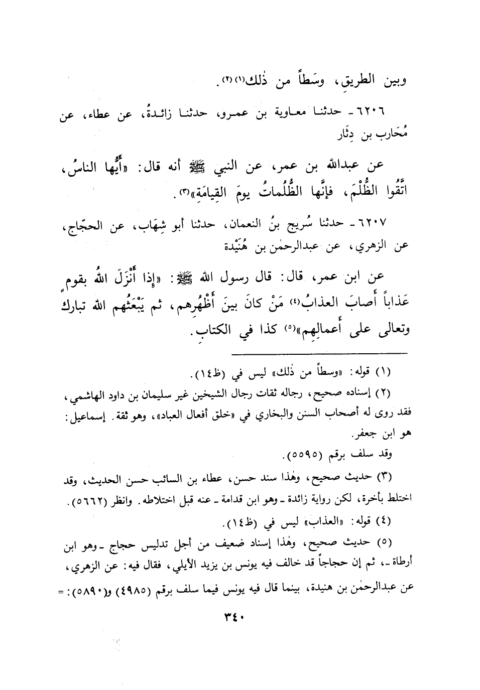 ٦٢٠٧ - حَدَّثَنَا سُرَيْجُ بْنُ النُّعْمَانِ، حَدَّثَنَا أَبُو شِهَابٍ، عَنِ الْحَجَّاجِ، عَنِ الزُّهْرِيِّ، عَنْ عَبْدِ الرَّحْمَنِ بْنِ هُنَيْدَةَ، عَنِ ابْنِ عُمَرَ قَالَ: قَالَ رَسُولُ اللهِ صَلَّى اللهُ عَلَيْهِ وَسَلَّمَ: " إِذَا أَنْزَلَ اللهُ بِقَوْمٍ عَذَابًا أَصَابَ الْعَذَابُ (٤) مَنْ كَانَ بَيْنَ أَظْهُرِهِمْ، ثُمَّ يَبْعَثُهُمُ اللهُ تَعَالَى عَلَى أَعْمَالِهِمْ " (٥) كَذَا فِي الْكِتَابِ