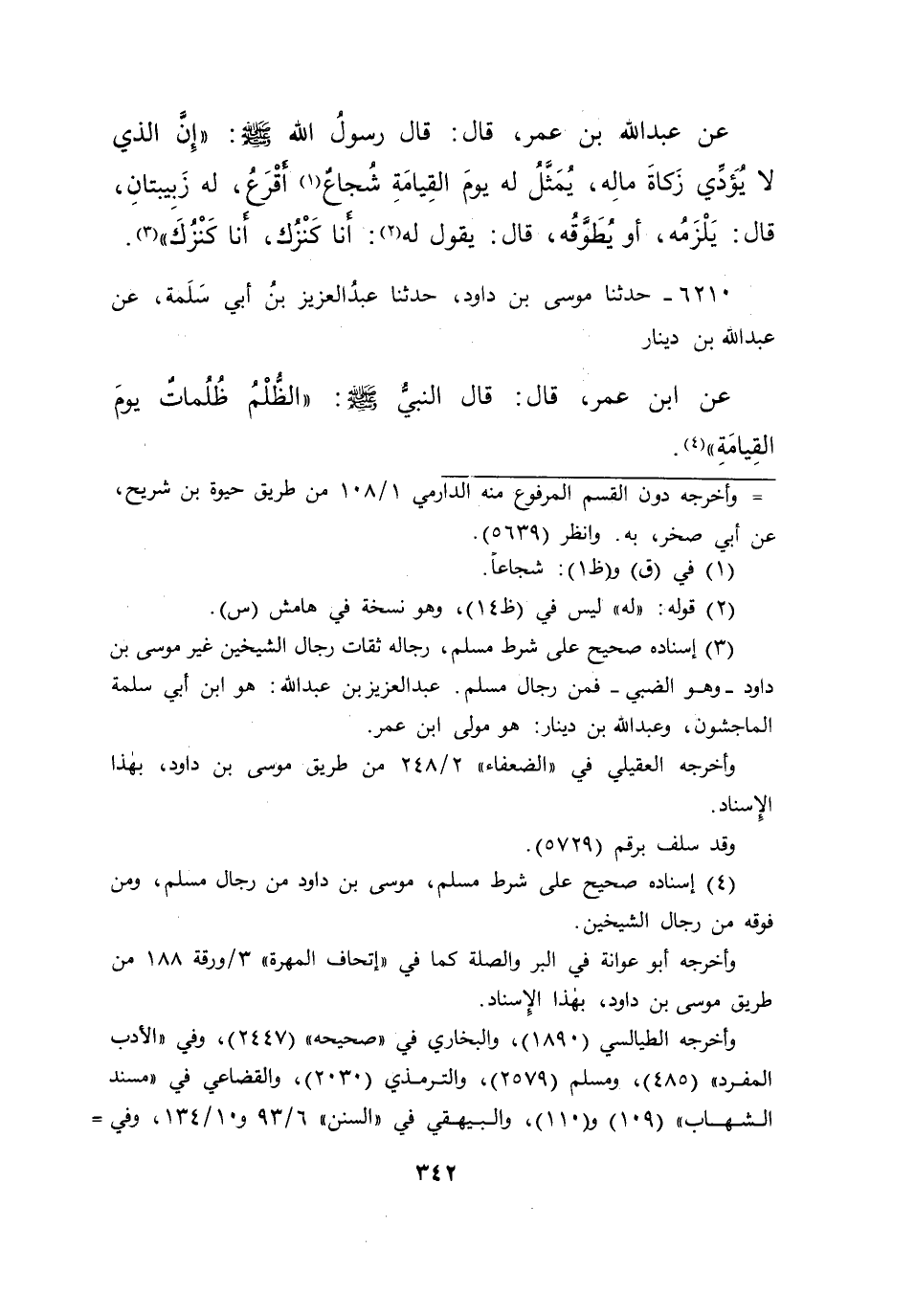 ٦٢١٠ - حَدَّثَنَا مُوسَى بْنُ دَاوُدَ، حَدَّثَنَا عَبْدُ الْعَزِيزِ بْنُ أَبِي سَلَمَةَ، عَنْ عَبْدِ اللهِ بْنِ دِينَارٍ، عَنِ ابْنِ عُمَرَ قَالَ: قَالَ النَّبِيُّ صَلَّى اللهُ عَلَيْهِ وَسَلَّمَ: " الظُّلْمُ ظُلُمَاتٌ يَوْمَ الْقِيَامَةِ " (٤)