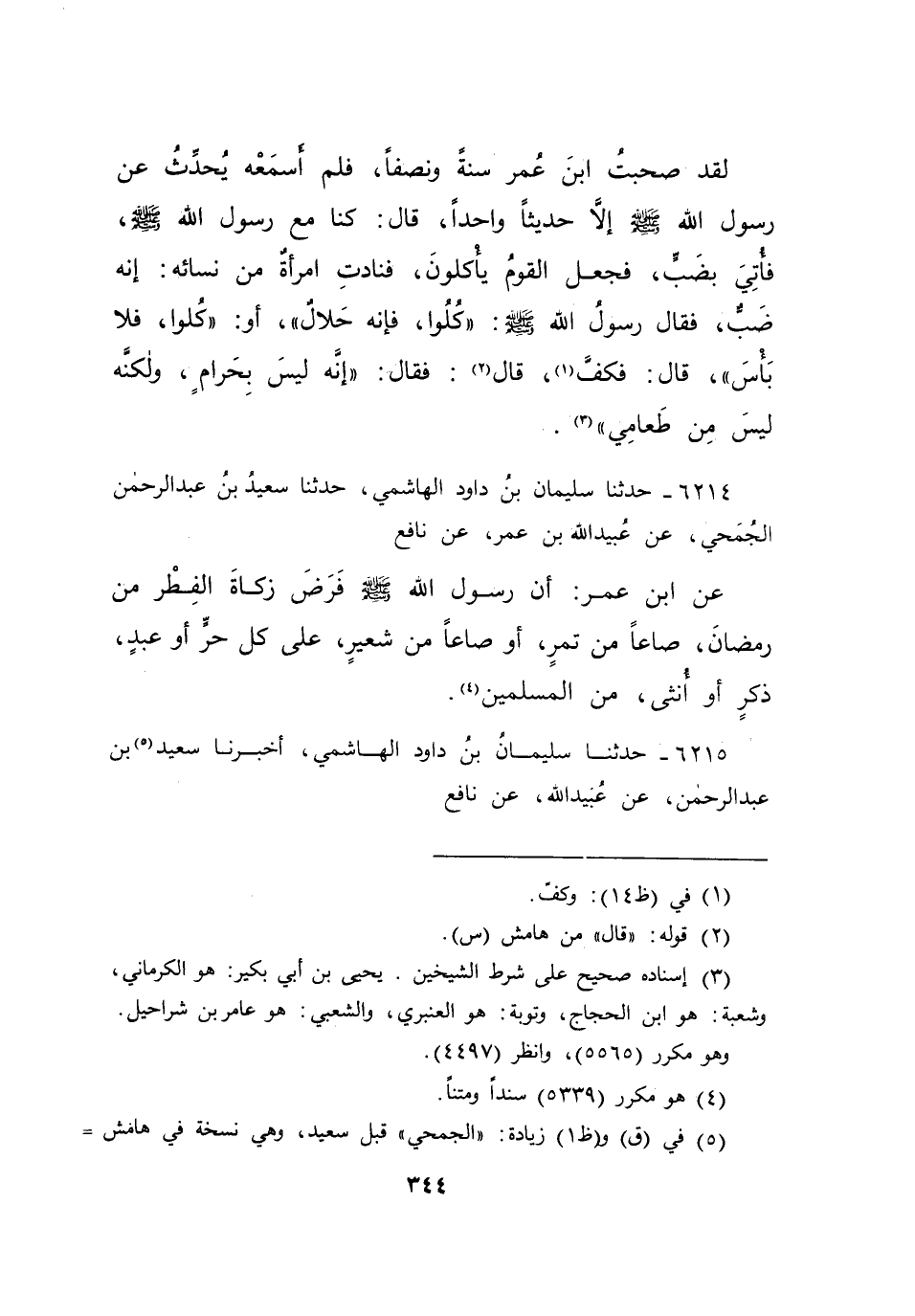 لَقَدْ صَحِبْتُ ابْنَ عُمَرَ سَنَةً وَنِصْفًا، فَلَمْ أَسْمَعْهُ يُحَدِّثُ عَنْ رَسُولِ اللهِ صَلَّى اللهُ عَلَيْهِ وَسَلَّمَ إِلَّا حَدِيثًا وَاحِدًا قَالَ: " كُنَّا مَعَ رَسُولِ اللهِ صَلَّى اللهُ عَلَيْهِ وَسَلَّمَ، فَأُتِيَ بِضَبٍّ، فَجَعَلَ الْقَوْمُ يَأْكُلُونَ، فَنَادَتِ امْرَأَةٌ مِنْ نِسَائِهِ إِنَّهُ ضَبٌّ، فَقَالَ رَسُولُ اللهِ صَلَّى اللهُ عَلَيْهِ وَسَلَّمَ: " كُلُوا فَإِنَّهُ حَلَالٌ، أَوْ كُلُوا فَلَا بَأْسَ " قَالَ: فَكَفَّ (١) . قَالَ (٢) : فَقَالَ: " إِنَّهُ لَيْسَ بِحَرَامٍ، وَلَكِنَّهُ لَيْسَ مِنْ طَعَامِي " (٣)