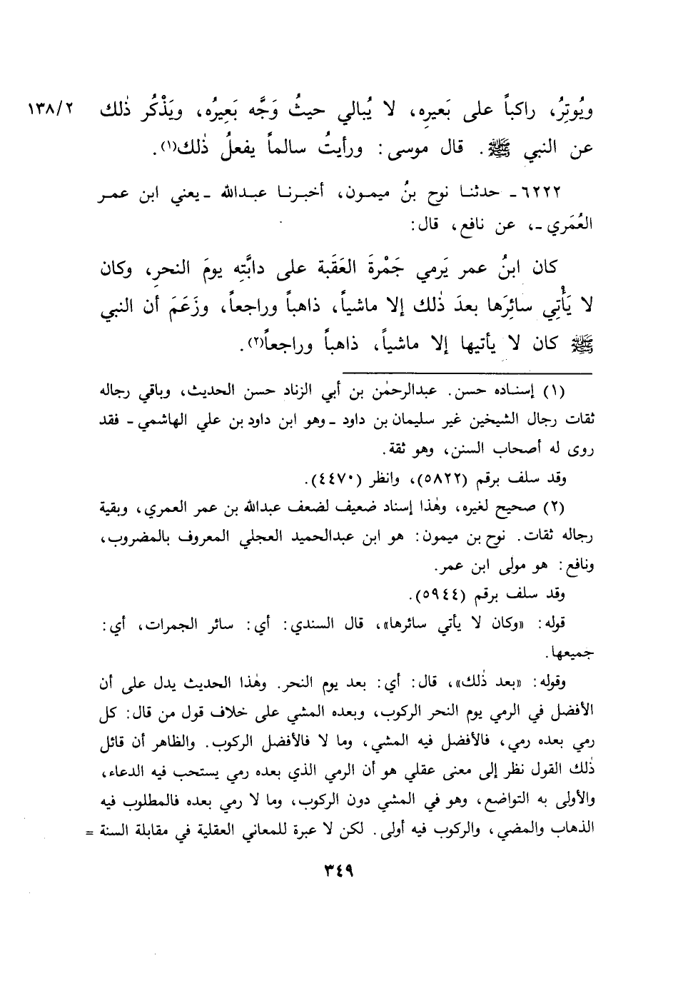 ٦٢٢٢ - حَدَّثَنَا نُوحُ بْنُ مَيْمُونٍ، أَخْبَرَنَا عَبْدُ اللهِ يَعْنِي ابْنَ عُمَرَ الْعُمَرِيَّ، عَنْ نَافِعٍ قَالَ: كَانَ ابْنُ عُمَرَ يَرْمِي جَمْرَةَ الْعَقَبَةِ عَلَى دَابَّتِهِ يَوْمَ النَّحْرِ، وَكَانَ لَا يَأْتِي سَائِرَهَا بَعْدَ ذَلِكَ إِلَّا مَاشِيًا ذَاهِبًا، وَرَاجِعًا، وَزَعَمَ " أَنَّ النَّبِيَّ صَلَّى اللهُ عَلَيْهِ وَسَلَّمَ كَانَ لَا يَأْتِيهَا إِلَّا مَاشِيًا ذَاهِبًا وَرَاجِعًا " (٢)