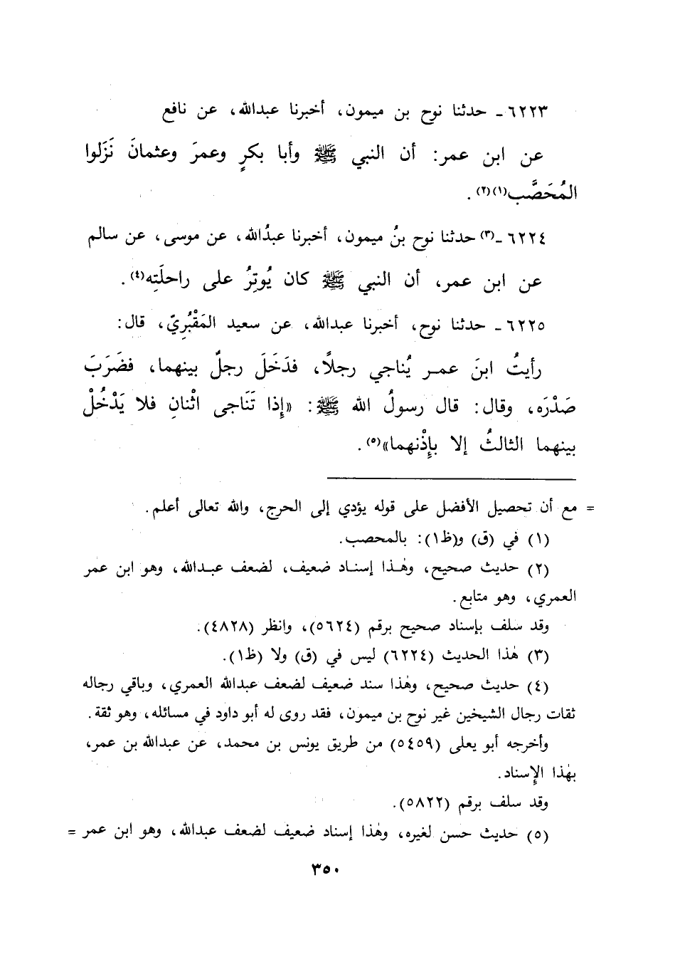 ٦٢٢٣ - حَدَّثَنَا نُوحُ بْنُ مَيْمُونٍ، أَخْبَرَنَا عَبْدُ اللهِ، عَنْ نَافِعٍ، عَنِ ابْنِ عُمَرَ، " أَنَّ النَّبِيَّ صَلَّى اللهُ عَلَيْهِ وَسَلَّمَ وَأَبَا بَكْرٍ وَعُمَرَ وَعُثْمَانَ نَزَلُوا الْمُحَصَّبَ (١) (٢)