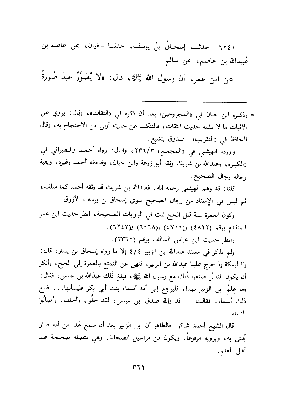 ٦٢٤١ - حَدَّثَنَا إِسْحَاقُ بْنُ يُوسُفَ، حَدَّثَنَا سُفْيَانُ، عَنْ عَاصِمِ بْنِ عُبَيْدِ اللهِ بْنِ عَاصِمٍ، عَنْ سَالِمٍ، عَنِ ابْنِ عُمَرَ، أَنَّ رَسُولَ اللهِ صَلَّى اللهُ عَلَيْهِ وَسَلَّمَ قَالَ: " لَا يُصَوِّرُ عَبْدٌ صُورَةً،