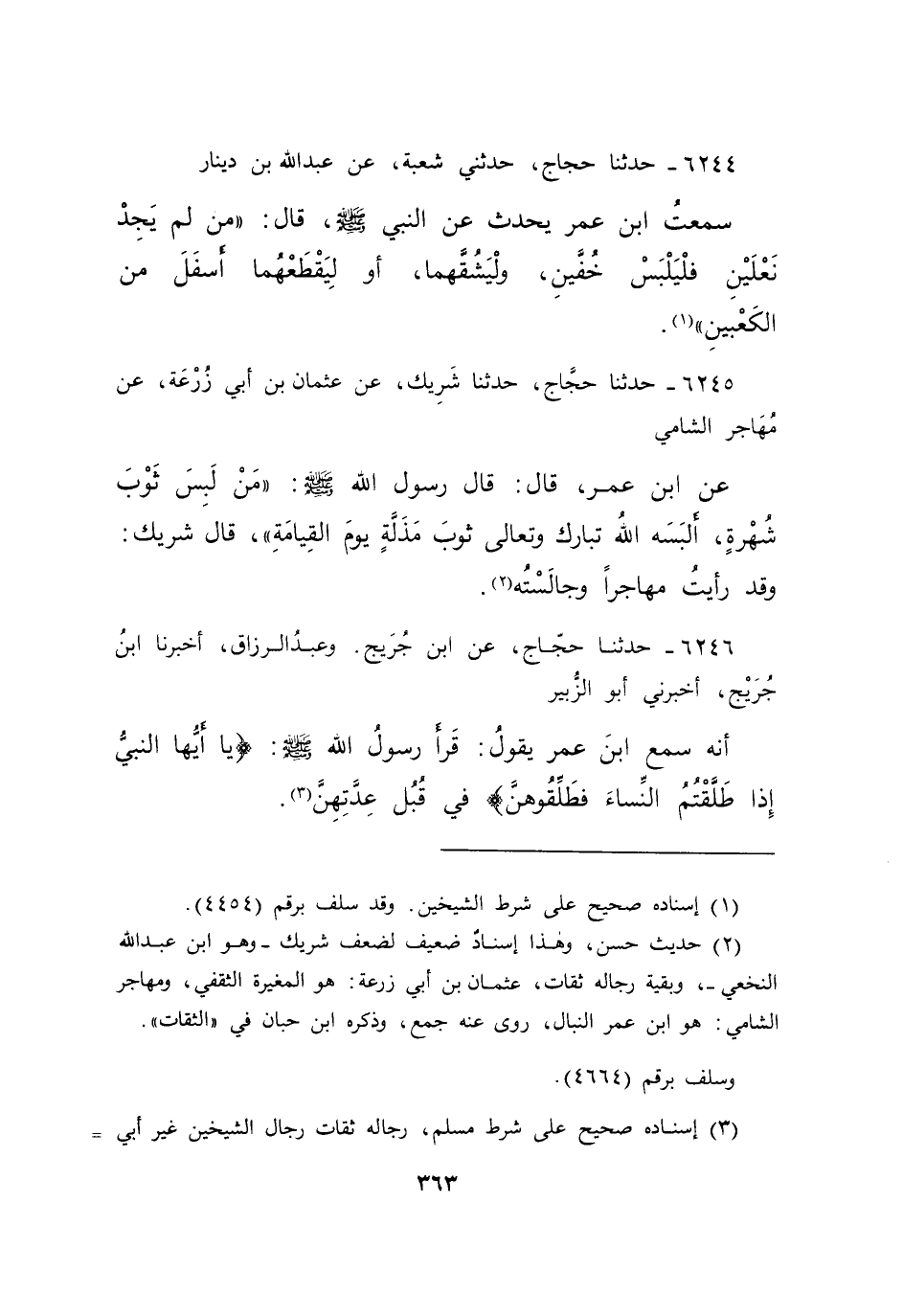 ٦٢٤٤ - حَدَّثَنَا حَجَّاجٌ، حَدَّثَنِي شُعْبَةُ، عَنْ عَبْدِ اللهِ بْنِ دِينَارٍ، سَمِعْتُ ابْنَ عُمَرَ يُحَدِّثُ، عَنِ النَّبِيِّ صَلَّى اللهُ عَلَيْهِ وَسَلَّمَ قَالَ: " مَنْ لَمْ يَجِدْ نَعْلَيْنِ، فَلْيَلْبَسْ خُفَّيْنِ، وَلْيَشُقَّهُمَا أَوْ لِيَقْطَعْهُمَا أَسْفَلَ مِنَ الْكَعْبَيْنِ " (١)