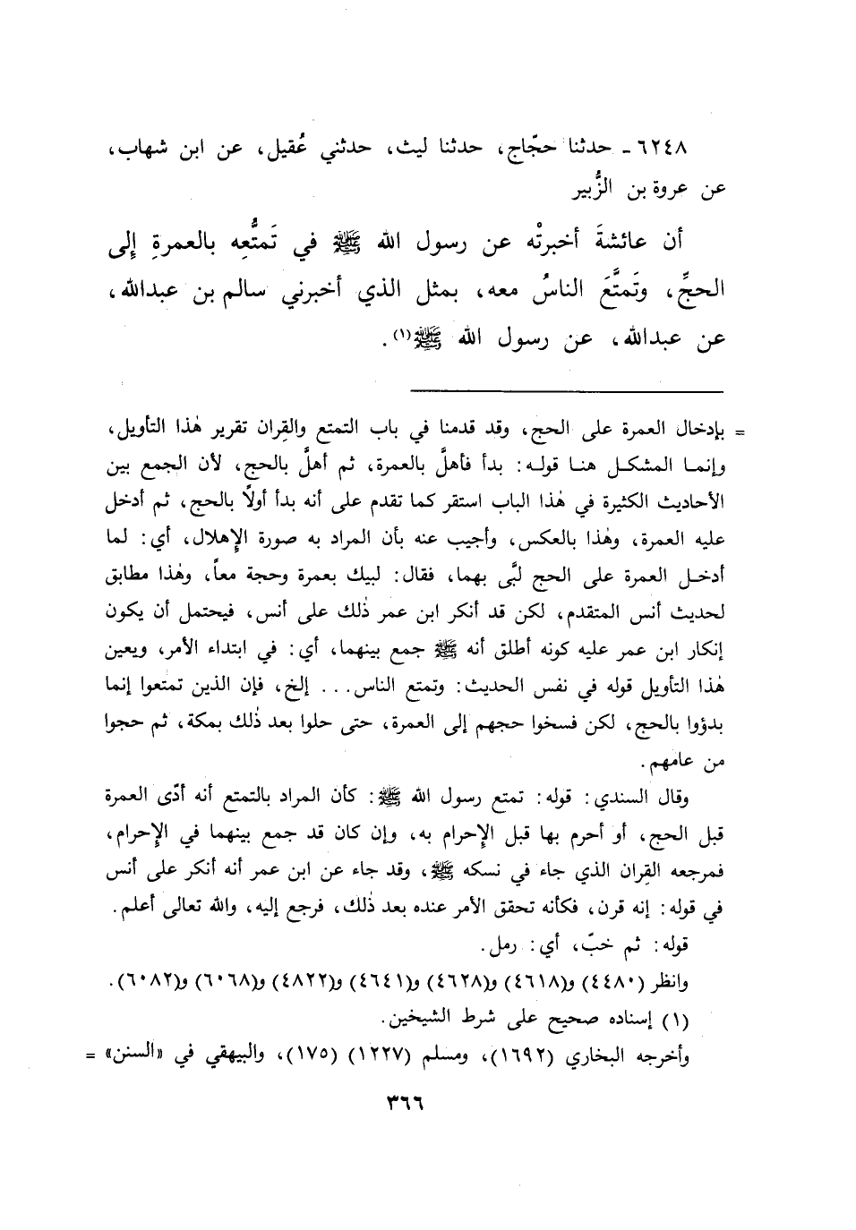 ٦٢٤٨ - حَدَّثَنَا حَجَّاجٌ، حَدَّثَنَا لَيْثٌ، حَدَّثَنِي عُقَيْلٌ، عَنِ ابْنِ شِهَابٍ، عَنْ عُرْوَةَ بْنِ الزُّبَيْرِ، أَنَّ عَائِشَةَ أَخْبَرَتْهُ، عَنْ رَسُولِ اللهِ صَلَّى اللهُ عَلَيْهِ وَسَلَّمَ فِي تَمَتُّعِهِ بِالْعُمْرَةِ إِلَى الْحَجِّ، وَتَمَتُّعِ النَّاسِ مَعَهُ بِمِثْلِ الَّذِي أَخْبَرَنِي سَالِمُ بْنُ عَبْدِ اللهِ، عَنْ عَبْدِ اللهِ، عَنْ رَسُولِ اللهِ صَلَّى اللهُ عَلَيْهِ وَسَلَّمَ (١)