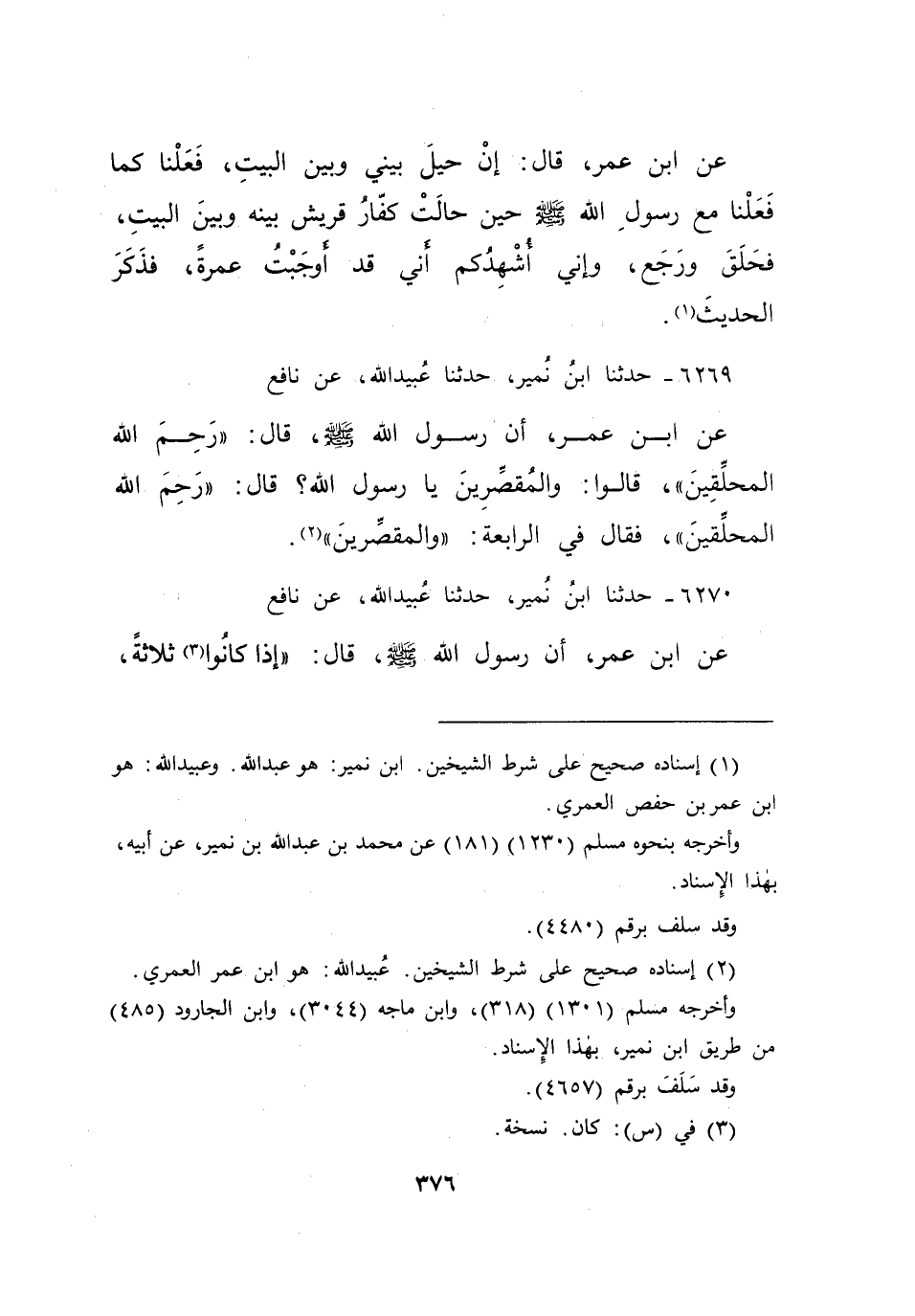 ٦٢٦٩ - حَدَّثَنَا ابْنُ نُمَيْرٍ، حَدَّثَنَا عُبَيْدُ اللهِ، عَنْ نَافِعٍ، عَنِ ابْنِ عُمَرَ، أَنَّ رَسُولَ اللهِ صَلَّى اللهُ عَلَيْهِ وَسَلَّمَ قَالَ: " رَحِمَ اللهُ الْمُحَلِّقِينَ " قَالُوا: وَالْمُقَصِّرِينَ يَا رَسُولَ اللهِ؟ قَالَ: " رَحِمَ اللهُ الْمُحَلِّقِينَ "، فَقَالَ فِي الرَّابِعَةِ: " وَالْمُقَصِّرِينَ " (٢)
