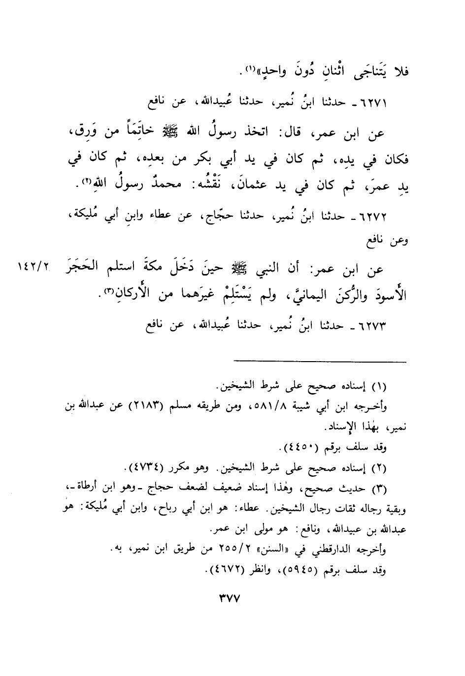 ٦٢٧٢ - حَدَّثَنَا ابْنُ نُمَيْرٍ، حَدَّثَنَا حَجَّاجٌ، عَنْ عَطَاءٍ، وَابْنِ أَبِي مُلَيْكَةَ، وَعَنْ نَافِعٍ، عَنِ ابْنِ عُمَرَ: " أَنَّ النَّبِيَّ صَلَّى اللهُ عَلَيْهِ وَسَلَّمَ حِينَ دَخَلَ مَكَّةَ اسْتَلَمَ الْحَجَرَ الْأَسْوَدَ وَالرُّكْنَ الْيَمَانِي، وَلَمْ يَسْتَلِمْ غَيْرَهُمَا مِنَ الْأَرْكَانِ " (٣)
