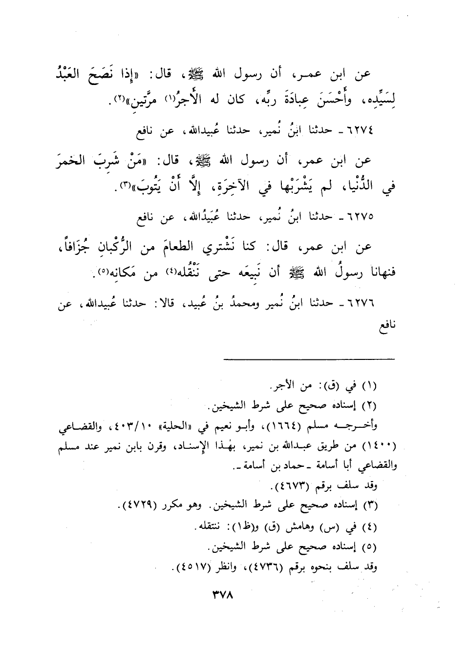٦٢٧٤ - حَدَّثَنَا ابْنُ نُمَيْرٍ، حَدَّثَنَا عُبَيْدُ اللهِ، عَنْ نَافِعٍ، عَنِ ابْنِ عُمَرَ، أَنَّ رَسُولَ اللهِ صَلَّى اللهُ عَلَيْهِ وَسَلَّمَ قَالَ: " مَنْ شَرِبَ الْخَمْرَ فِي الدُّنْيَا، لَمْ يَشْرَبْهَا فِي الْآخِرَةِ، إِلَّا أَنْ يَتُوبَ " (٣)