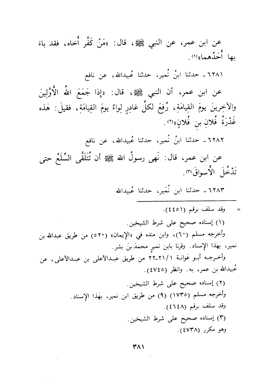 ٦٢٨١ - حَدَّثَنَا ابْنُ نُمَيْرٍ، حَدَّثَنَا عُبَيْدُ اللهِ، عَنْ نَافِعٍ، عَنِ ابْنِ عُمَرَ، أَنَّ النَّبِيَّ صَلَّى اللهُ عَلَيْهِ وَسَلَّمَ قَالَ: " إِذَا جَمَعَ اللهُ الْأَوَّلِينَ وَالْآخِرِينَ يَوْمَ الْقِيَامَةِ، رُفِعَ لِكُلِّ غَادِرٍ لِوَاءٌ يَوْمَ الْقِيَامَةِ، فَقِيلَ: هَذِهِ غَدْرَةُ فُلَانِ بْنِ فُلَانٍ " (٢)