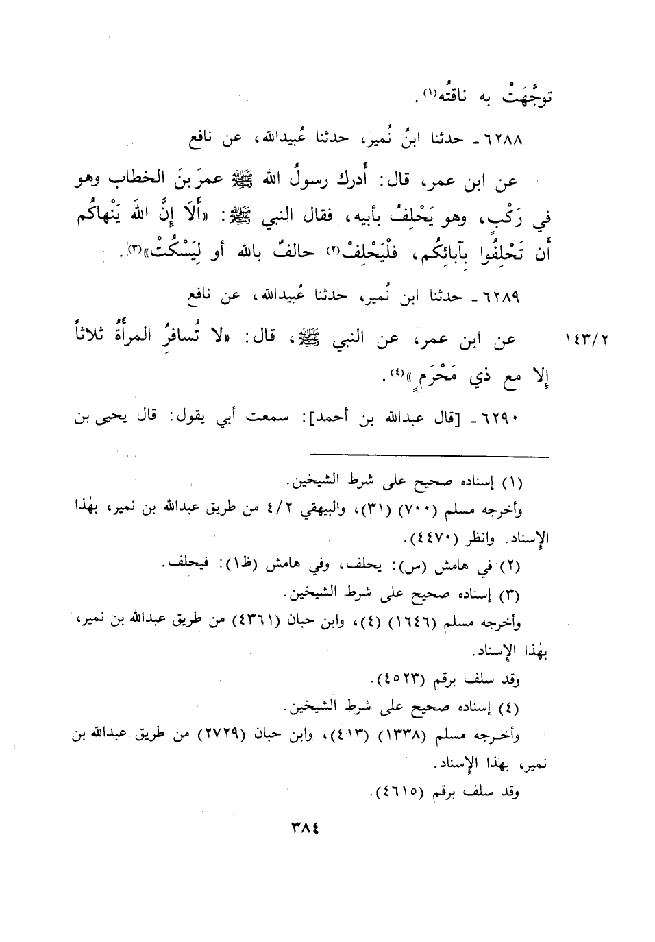 ٦٢٨٨ - حَدَّثَنَا ابْنُ نُمَيْرٍ، حَدَّثَنَا عُبَيْدُ اللهِ، عَنْ نَافِعٍ، عَنِ ابْنِ عُمَرَ، قَالَ: أَدْرَكَ رَسُولُ اللهِ صَلَّى اللهُ عَلَيْهِ وَسَلَّمَ عُمَرَ بْنَ الْخَطَّابِ وَهُوَ فِي رَكْبٍ، وَهُوَ يَحْلِفُ بِأَبِيهِ، فَقَالَ النَّبِيُّ صَلَّى اللهُ عَلَيْهِ وَسَلَّمَ: " أَلَا إِنَّ اللهَ يَنْهَاكُمْ أَنْ تَحْلِفُوا بِآبَائِكُمْ، فَلْيَحْلِفْ (٢) حَالِفٌ بِاللهِ أَوْ لِيَسْكُتْ " (٣)