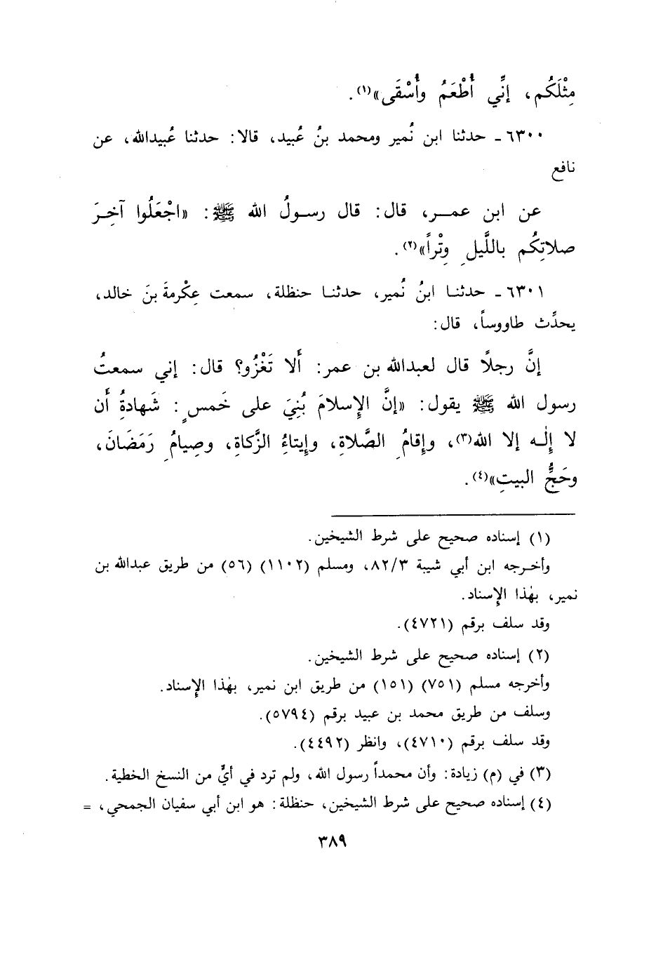 ٦٣٠١ - حَدَّثَنَا ابْنُ نُمَيْرٍ، حَدَّثَنَا حَنْظَلَةُ، سَمِعْتُ عِكْرِمَةَ بْنَ خَالِدٍ، يُحَدِّثُ طَاوُسًا، قَالَ: إِنَّ رَجُلًا قَالَ: لِعَبْدِ اللهِ بْنِ عُمَرَ: أَلَا تَغْزُو؟ قَالَ: إِنِّي سَمِعْتُ رَسُولَ اللهِ صَلَّى اللهُ عَلَيْهِ وَسَلَّمَ يَقُولُ: " إِنَّ الْإِسْلَامَ بُنِيَ عَلَى خَمْسٍ: شَهَادَةُ أَنْ لَا إِلَهَ إِلَّا اللهُ (٣) ، وَإِقَامُ الصَّلَاةِ، وَإِيتَاءُ الزَّكَاةِ، وَصِيَامُ رَمَضَانَ، وَحَجُّ الْبَيْتِ " (٤)
