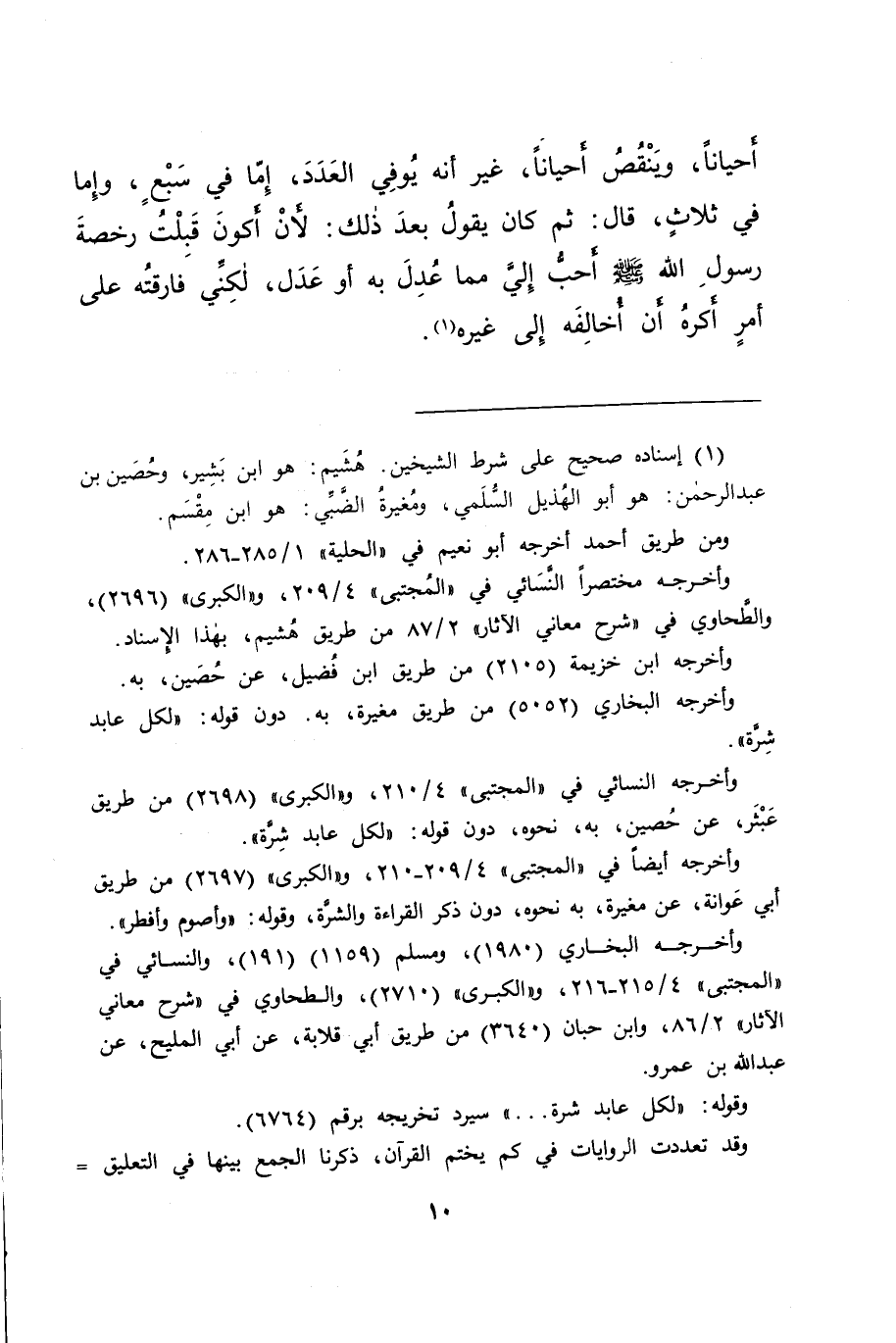 أَحْيَانًا، وَيَنْقُصُ أَحْيَانًا، غَيْرَ أَنَّهُ يُوفِي الْعَدَدَ، إِمَّا فِي سَبْعٍ، وَإِمَّا فِي ثَلَاثٍ، قَالَ: ثُمَّ كَانَ يَقُولُ بَعْدَ ذَلِكَ: " لَأَنْ أَكُونَ قَبِلْتُ رُخْصَةَ رَسُولِ اللهِ صَلَّى اللهُ عَلَيْهِ وَسَلَّمَ أَحَبُّ إِلَيَّ مِمَّا عُدِلَ بِهِ أَوْ عَدَلَ، لَكِنِّي فَارَقْتُهُ عَلَى أَمْرٍ أَكْرَهُ أَنْ أُخَالِفَهُ إِلَى غَيْرِهِ " (١)