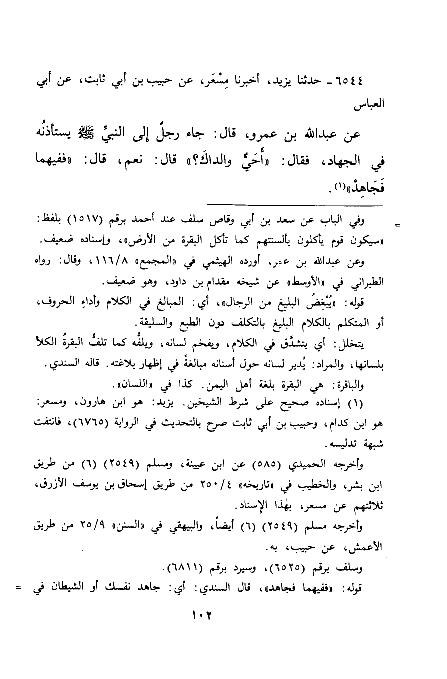 ٦٥٤٤ - حَدَّثَنَا يَزِيدُ، أَخْبَرَنَا مِسْعَرٌ، عَنْ حَبِيبِ بْنِ أَبِي ثَابِتٍ، عَنْ أَبِي الْعَبَّاسِ، عَنْ عَبْدِ اللهِ بْنِ عَمْرٍو، قَالَ: جَاءَ رَجُلٌ إِلَى النَّبِيِّ صَلَّى اللهُ عَلَيْهِ وَسَلَّمَ يَسْتَأْذِنُهُ فِي الْجِهَادِ، فَقَالَ: " أَحَيٌّ وَالِدَاكَ؟ " قَالَ: نَعَمْ قَالَ: " فَفِيهِمَا فَجَاهِدْ " (١)