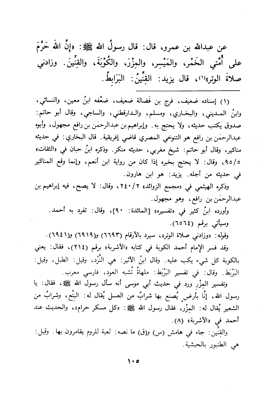 عَنْ عَبْدِ اللهِ بْنِ عَمْرٍو، قَالَ: قَالَ رَسُولُ اللهِ صَلَّى اللهُ عَلَيْهِ وَسَلَّمَ: " إِنَّ اللهَ حَرَّمَ عَلَى أُمَّتِي الْخَمْرَ وَالْمَيْسِرَ وَالْمِزْرَ وَالْكُوبَةَ وَالْقِنِّينَ وَزَادَنِي صَلَاةَ الْوَتْرِ " (١) قَالَ يَزِيدُ: " الْقِنِّينُ: الْبَرَابِطُ "