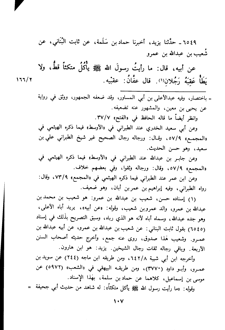 ٦٥٤٩ - حَدَّثَنَا يَزِيدُ، أَخْبَرَنَا حَمَّادُ بْنُ سَلَمَةَ، عَنْ ثَابِتٍ الْبُنَانِيِّ، عَنْ شُعَيْبِ بْنِ عَبْدِ اللهِ بْنِ عَمْرٍو، عَنْ أَبِيهِ، قَالَ: " مَا رَأَيْتُ رَسُولَ اللهِ صَلَّى اللهُ عَلَيْهِ وَسَلَّمَ يَأْكُلُ مُتَّكِئًا قَطُّ، وَلَا يَطَأُ عَقِبَهُ رَجُلَانِ (١) " قَالَ عَفَّانُ: " عَقِبَيْهِ "