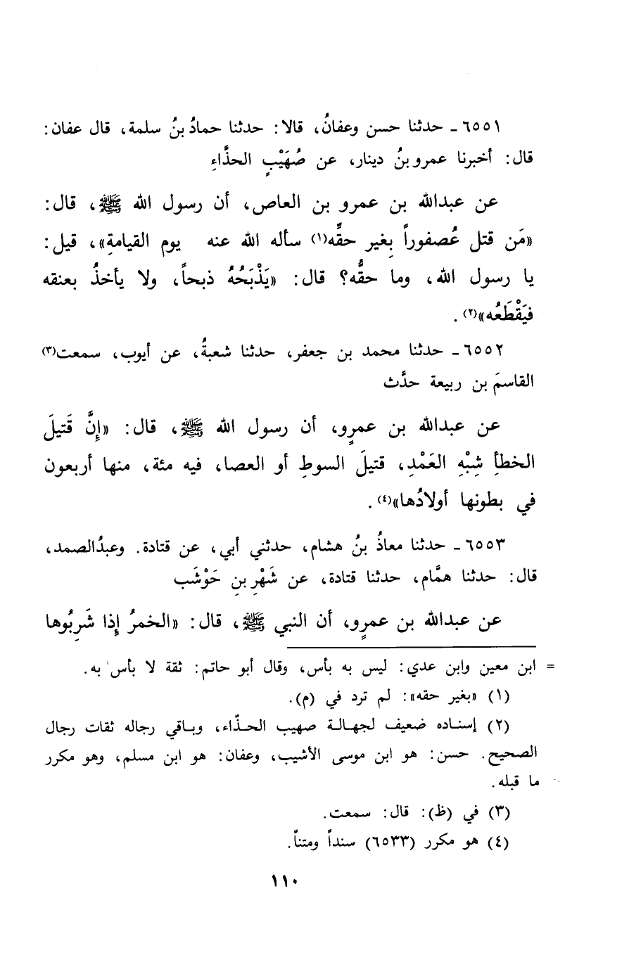 ٦٥٥١ - حَدَّثَنَا حَسَنٌ، وَعَفَّانُ قَالَا: حَدَّثَنَا حَمَّادُ بْنُ سَلَمَةَ، قَالَ عَفَّانُ: قَالَ: أَخْبَرَنَا عَمْرُو بْنُ دِينَارٍ، عَنْ صُهَيْبٍ الْحَذَّاءِ، عَنْ عَبْدِ اللهِ بْنِ عَمْرِو بْنِ الْعَاصِ، أَنَّ رَسُولَ اللهِ صَلَّى اللهُ عَلَيْهِ وَسَلَّمَ قَالَ: " مَنْ قَتَلَ عُصْفُورًا بغير حقِّه (١) سَأَلَهُ اللهُ عَنْهُ يَوْمَ الْقِيَامَةِ " قِيلَ يَا رَسُولَ اللهِ وَمَا حَقُّهُ؟ " قَالَ: " يَذْبَحُهُ ذَبْحًا، وَلَا يَأْخُذُ بِعُنُقِهِ فَيَقْطَعُهُ " (٢)