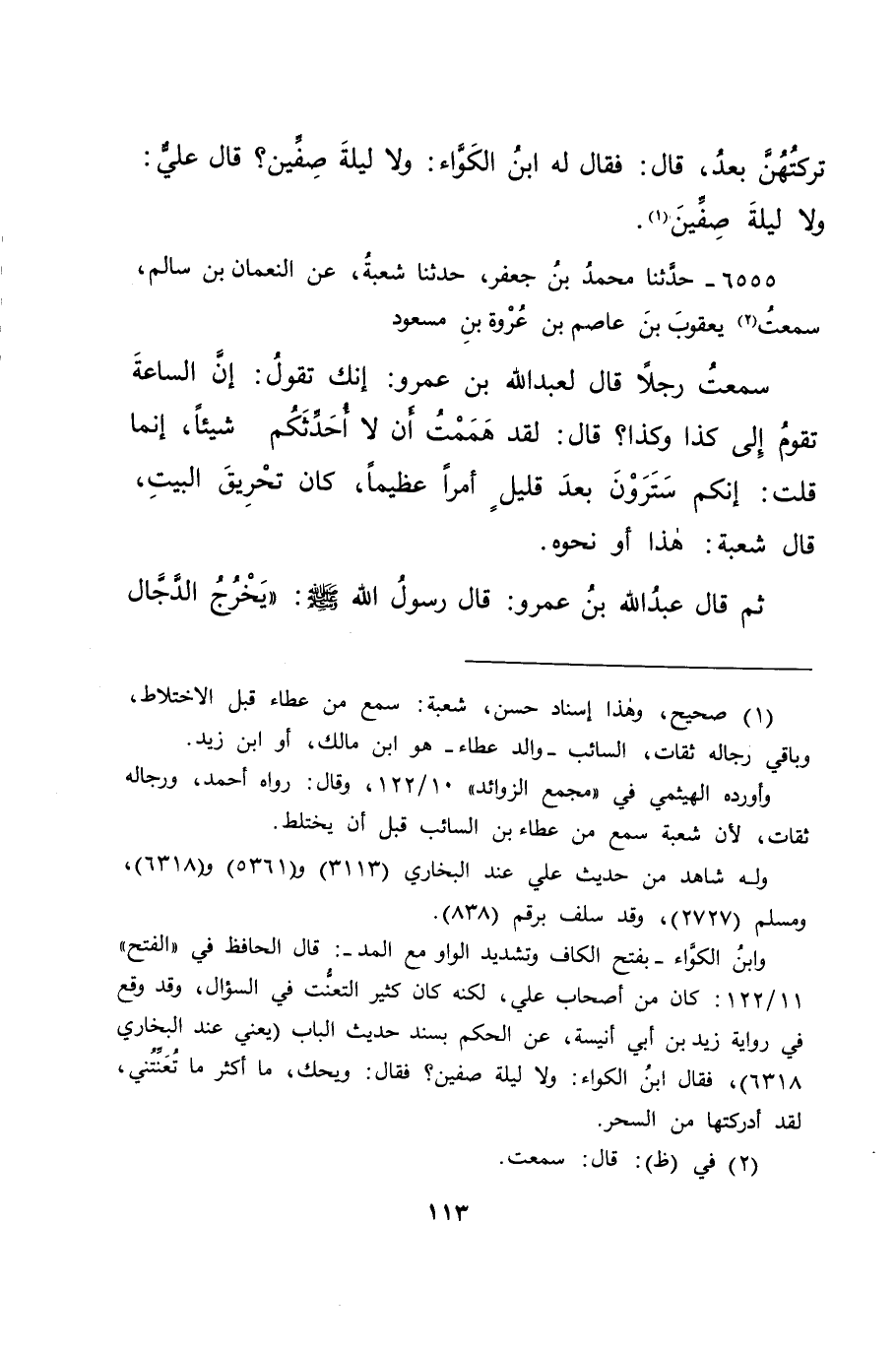 ٦٥٥٥ - حَدَّثَنَا مُحَمَّدُ بْنُ جَعْفَرٍ، حَدَّثَنَا شُعْبَةُ، عَنِ النُّعْمَانِ بْنِ سَالِمٍ، سَمِعْتُ (٢) يَعْقُوبَ بْنَ عَاصِمِ بْنِ عُرْوَةَ بْنِ مَسْعُودٍ، سَمِعْتُ رَجُلًا قَالَ لِعَبْدِ اللهِ بْنِ عَمْرٍو إِنَّكَ تَقُولُ: إِنَّ السَّاعَةَ تَقُومُ إِلَى كَذَا وَكَذَا؟ قَالَ: لَقَدْ هَمَمْتُ أَنْ لَا أُحَدِّثَكُمْ شَيْئًا، إِنَّمَا قُلْتُ: إِنَّكُمْ سَتَرَوْنَ بَعْدَ قَلِيلٍ أَمْرًا عَظِيمًا، كَانَ تَحْرِيقَ الْبَيْتِ قَالَ شُعْبَةُ: هَذَا أَوْ نَحْوَهُ، ثُمَّ قَالَ عَبْدُ اللهِ بْنُ عَمْرٍو: قَالَ رَسُولُ اللهِ صَلَّى اللهُ عَلَيْهِ وَسَلَّمَ: " يَخْرُجُ الدَّجَّالُ