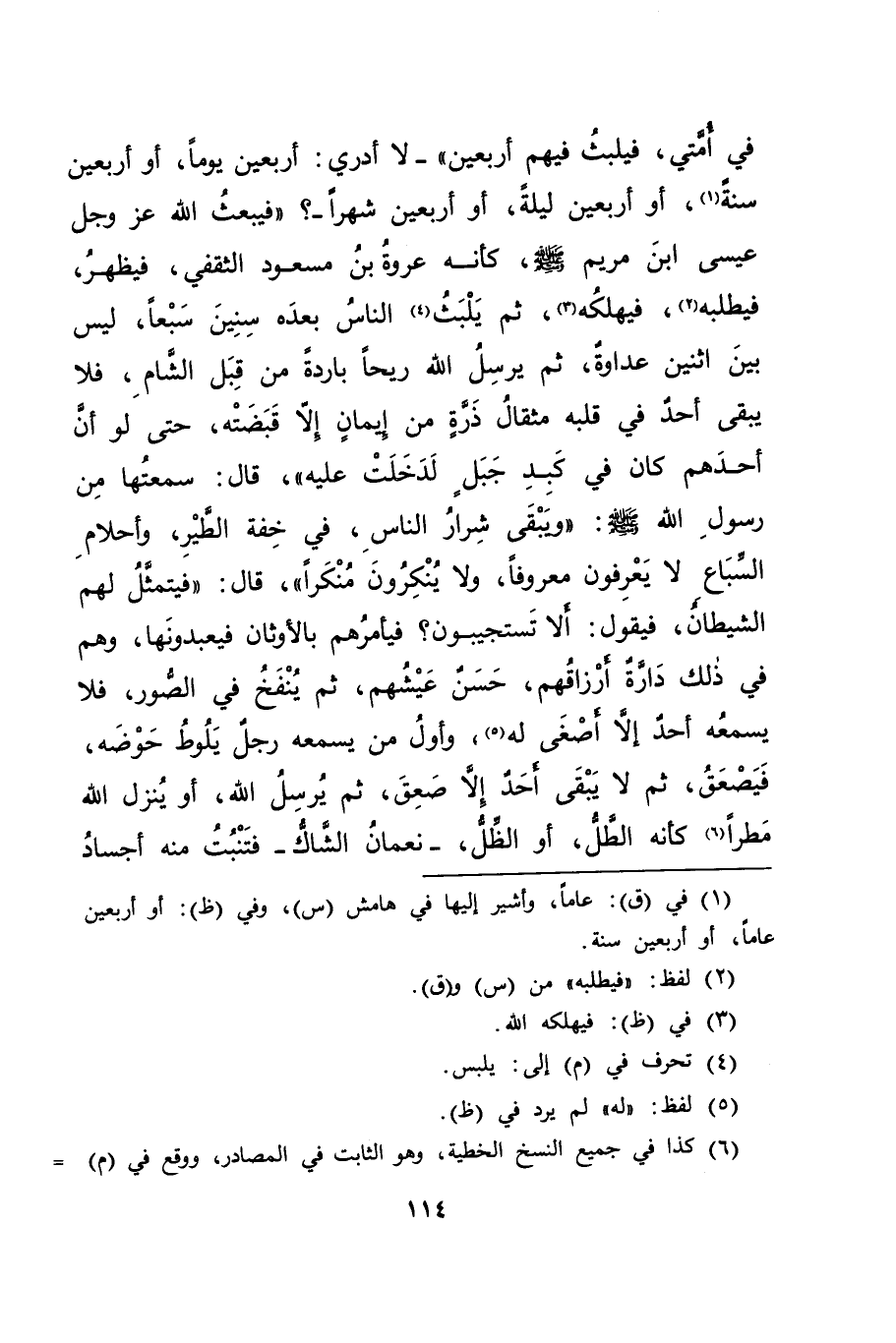 فِي أُمَّتِي، فَيَلْبَثُ فِيهِمْ أَرْبَعِينَ " - لَا أَدْرِي أَرْبَعِينَ يَوْمًا، أَوْ أَرْبَعِينَ سَنَةً (١) ، أَوْ أَرْبَعِينَ لَيْلَةً، أَوْ أَرْبَعِينَ شَهْرًا؟ - " فَيَبْعَثُ اللهُ عَزَّ وَجَلَّ عِيسَى ابْنَ مَرْيَمَ صَلَّى اللهُ عَلَيْهِ وَسَلَّمَ، كَأَنَّهُ عُرْوَةُ بْنُ مَسْعُودٍ الثَّقَفِيُّ، فَيَظْهَرُ فَيَطْلُبُهُ (٢) فَيُهْلِكُهُ (٣) ، ثُمَّ يَلْبَثُ (٤) النَّاسُ بَعْدَهُ سِنِينَ سَبْعًا، لَيْسَ بَيْنَ اثْنَيْنِ عَدَاوَةٌ، ثُمَّ يُرْسِلُ اللهُ رِيحًا بَارِدَةً مِنْ قِبَلِ الشَّامِ، فَلَا يَبْقَى أَحَدٌ فِي قَلْبِهِ مِثْقَالُ ذَرَّةٍ مِنْ إِيمَانٍ إِلَّا قَبَضَتْهُ، حَتَّى لَوْ أَنَّ أَحَدَهُمْ كَانَ فِي كَبِدِ جَبَلٍ لَدَخَلَتْ عَلَيْهِ " قَالَ: سَمِعْتُهَا مِنْ رَسُولِ اللهِ صَلَّى اللهُ عَلَيْهِ وَسَلَّمَ: " وَيَبْقَى شِرَارُ النَّاسِ، فِي خِفَّةِ الطَّيْرِ، وَأَحْلَامِ السِّبَاعِ، لَا يَعْرِفُونَ مَعْرُوفًا، وَلَا يُنْكِرُونَ مُنْكَرًا " قَالَ: " فَيَتَمَثَّلُ لَهُمُ الشَّيْطَانُ، فَيَقُولُ: أَلَا تَسْتَجِيبُونَ؟ فَيَأْمُرُهُمْ بِالْأَوْثَانِ فَيَعْبُدُونَهَا، وَهُمْ فِي ذَلِكَ دَارَّةٌ أَرْزَاقُهُمْ، حَسَنٌ عَيْشُهُمْ، ثُمَّ يُنْفَخُ فِي الصُّورِ، فَلَا يَسْمَعُهُ أَحَدٌ إِلَّا أَصْغَى لَهُ (٥) ، وَأَوَّلُ مَنْ يَسْمَعُهُ رَجُلٌ يَلُوطُ حَوْضَهُ فَيَصْعَقُ، ثُمَّ لَا يَبْقَى أَحَدٌ إِلَّا صَعِقَ، ثُمَّ يُرْسِلُ اللهُ، أَوْ يُنْزِلُ اللهُ مَطَرًا (٦) كَأَنَّهُ الطَّلُّ أَوِ الظِّلُّ - نُعْمَانُ الشَّاكُّ - فَتَنْبُتُ مِنْهُ أَجْسَادُ