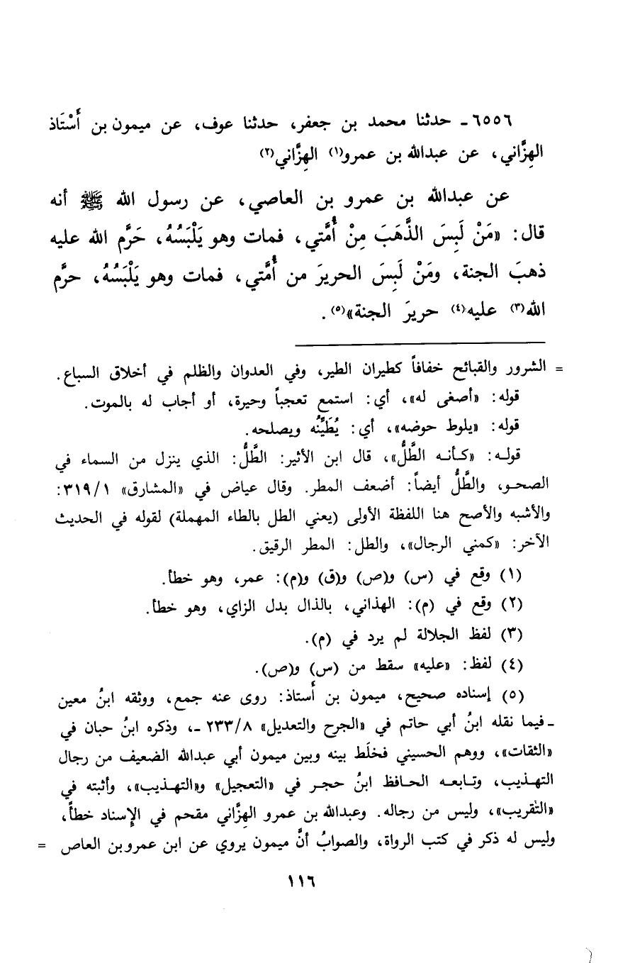 ٦٥٥٦ - حَدَّثَنَا مُحَمَّدُ بْنُ جَعْفَرٍ، حَدَّثَنَا عَوْفٌ، عَنْ مَيْمُونِ بْنِ أَسْتَاذَ الْهِزَّانِيِّ، عَنْ عَبْدِ اللهِ بْنِ عَمْرِو (١) الْهِزَّانِيِّ (٢) عَنْ عَبْدِ اللهِ بْنِ عَمْرِو بْنِ الْعَاصِي، عَنْ رَسُولِ اللهِ صَلَّى اللهُ عَلَيْهِ وَسَلَّمَ أَنَّهُ قَالَ: " مَنْ لَبِسَ الذَّهَبَ مِنْ أُمَّتِي، فَمَاتَ وَهُوَ يَلْبَسُهُ، حَرَّمَ اللهُ عَلَيْهِ ذَهَبَ الْجَنَّةِ، وَمَنْ لَبِسَ الْحَرِيرَ مِنْ أُمَّتِي، فَمَاتَ وَهُوَ يَلْبَسُهُ، حَرَّمَ اللهُ (٣) عَلَيْهِ (٤) حَرِيرَ الْجَنَّةِ " (٥)