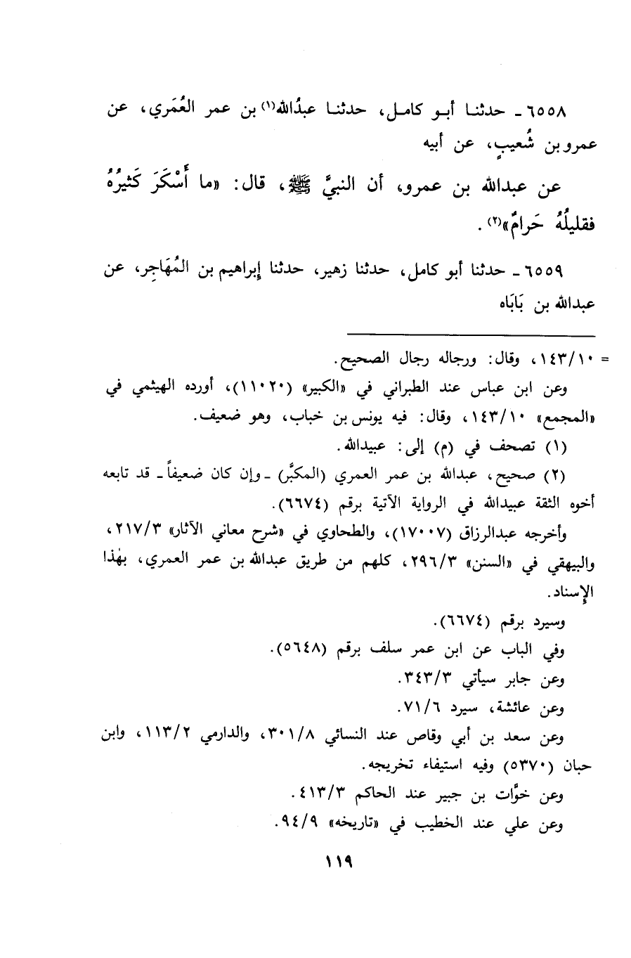 ٦٥٥٨ - حَدَّثَنَا أَبُو كَامِلٍ، حَدَّثَنَا عبدُ اللهِ (١) بْنُ عُمَرَ الْعُمَرِيُّ، عَنْ عَمْرِو بْنِ شُعَيْبٍ، عَنْ أَبِيهِ، عَنْ عَبْدِ اللهِ بْنِ عَمْرٍو، أَنَّ النَّبِيَّ صَلَّى اللهُ عَلَيْهِ وَسَلَّمَ قَالَ: " مَا أَسْكَرَ كَثِيرُهُ، فَقَلِيلُهُ حَرَامٌ " (٢)
