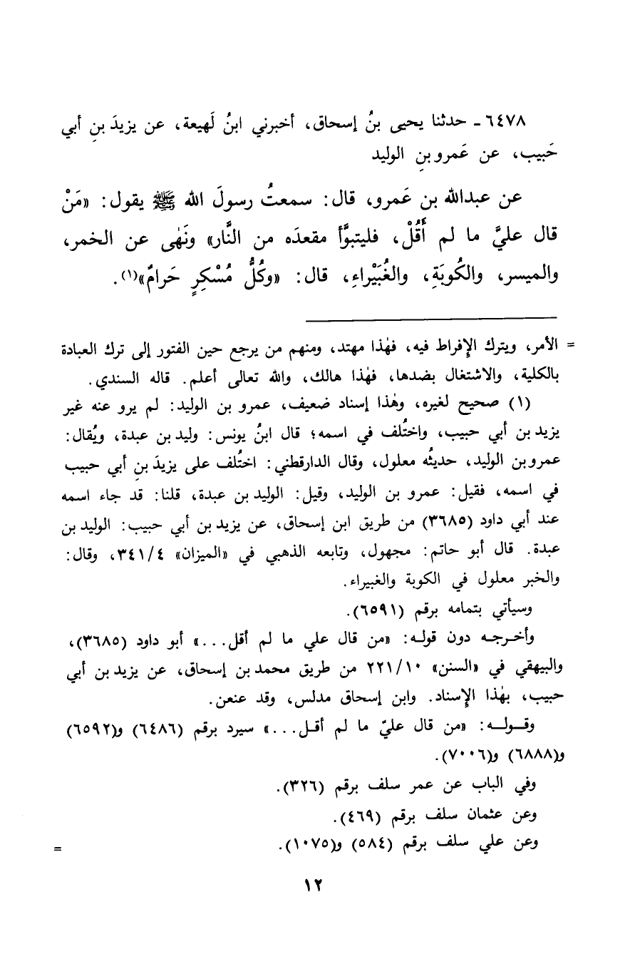٦٤٧٨ - حَدَّثَنَا يَحْيَى بْنُ إِسْحَاقَ، أَخْبَرَنِي ابْنُ لَهِيعَةَ، عَنْ يَزِيدَ بْنِ أَبِي حَبِيبٍ، عَنْ عَمْرِو بْنِ الْوَلِيدِ، عَنْ عَبْدِ اللهِ بْنِ عَمْرٍو، قَالَ: سَمِعْتُ رَسُولَ اللهِ صَلَّى اللهُ عَلَيْهِ وَسَلَّمَ يَقُولُ: " مَنْ قَالَ عَلَيَّ مَا لَمْ أَقُلْ، فَلْيَتَبَوَّأْ مَقْعَدَهُ مِنَ النَّارِ "