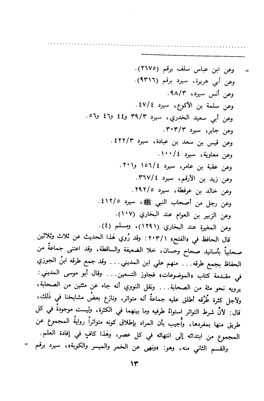 ولأجل كثرة طُرُقه أطلق عليه جماعةٌ أنه متواتر، ونازع بعضُ مشايخنا في ذلك، قال: لأن شرط التواتر استواءُ طرفيه وما بينهما في الكثرة، وليست موجودةً في كل طريق منها بمفردها، وأُجيب بأن المراد بإطلاق كونه متواتراً روايةُ المجموع عن المجموع من ابتدائه إلى انتهائه في كل عصر، وهذا كافٍ في إفادة العلم.