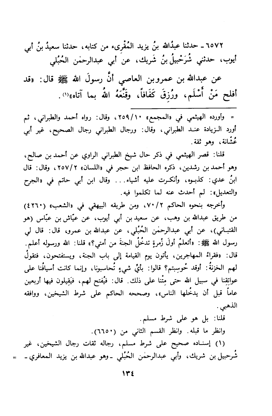 ٦٥٧٢ - حَدَّثَنَا عَبْدُ اللهِ بْنُ يَزِيدَ الْمُقْرِئُ، مِنْ كِتَابِهِ حَدَّثَنَا سَعِيدُ بْنُ أَبِي أَيُّوبَ، حَدَّثَنِي شُرَحْبِيلُ بْنُ شَرِيكٍ، عَنْ أَبِي عَبْدِ الرَّحْمَنِ الْحُبُلِيِّ، عَنْ عَبْدِ اللهِ بْنِ عَمْرِو بْنِ الْعَاصِي، أَنَّ رَسُولَ اللهِ صَلَّى اللهُ عَلَيْهِ وَسَلَّمَ قَالَ: " قَدْ أَفْلَحَ مَنْ أَسْلَمَ، وَرُزِقَ كَفَافًا، وقَنَّعَهُ اللهُ بِمَا آتَاهُ " (١)