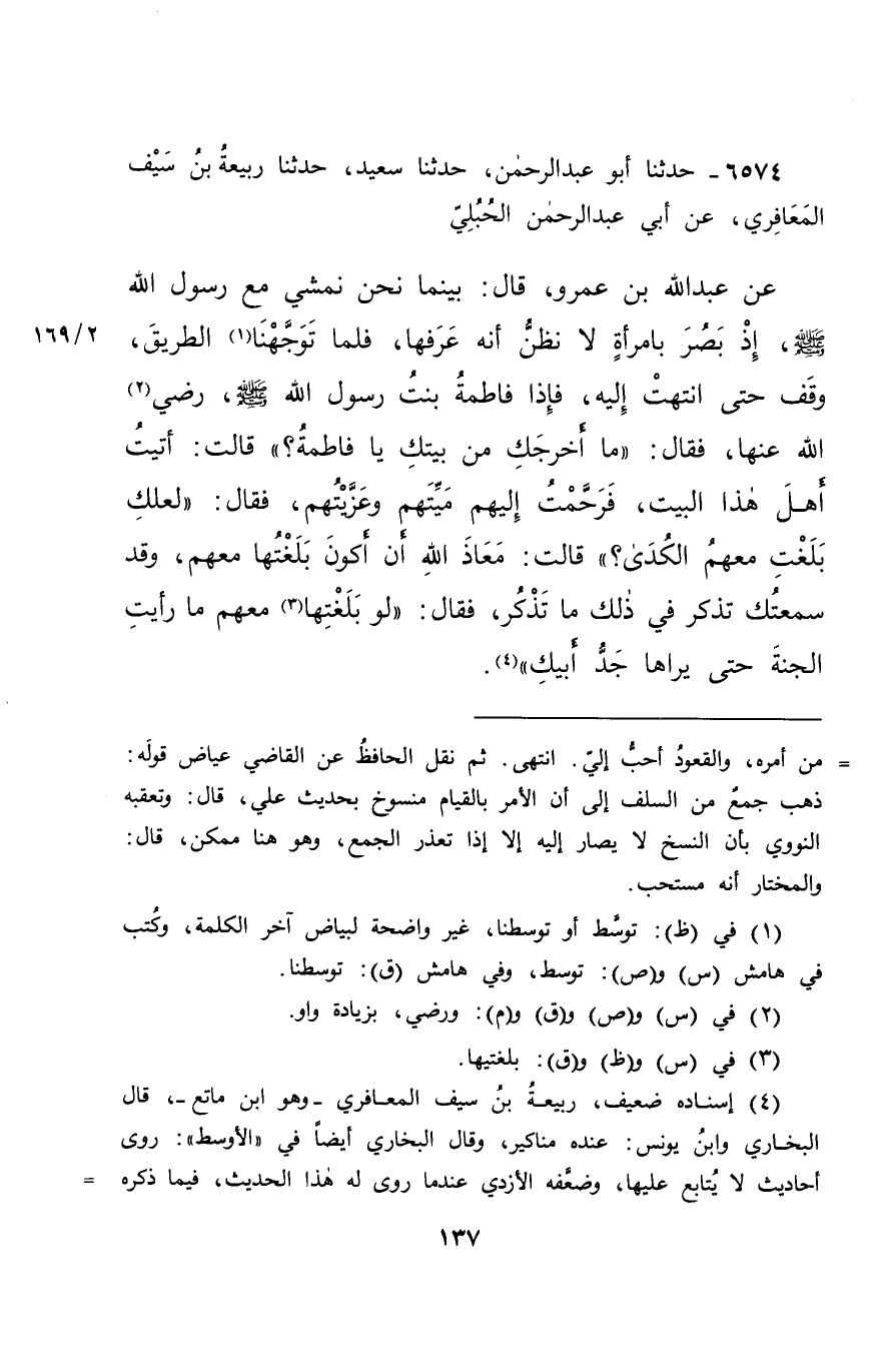 ٦٥٧٤ - حَدَّثَنَا أَبُو عَبْدِ الرَّحْمَنِ، حَدَّثَنَا سَعِيدٌ، حَدَّثَنَا رَبِيعَةُ بْنُ سَيْفٍ الْمَعَافِرِيُّ، عَنْ أَبِي عَبْدِ الرَّحْمَنِ الْحُبُلِيِّ، عَنْ عَبْدِ اللهِ بْنِ عَمْرٍو، قَالَ: بَيْنَمَا نَحْنُ نَمْشِي مَعَ رَسُولِ اللهِ صَلَّى اللهُ عَلَيْهِ وَسَلَّمَ إِذْ بَصُرَ بِامْرَأَةٍ لَا نَظُنُّ أَنَّهُ عَرَفَهَا، فَلَمَّا تَوَجَّهْنَا (١) الطَّرِيقَ، وَقَفَ حَتَّى انْتَهَتْ إِلَيْهِ، فَإِذَا فَاطِمَةُ بِنْتُ رَسُولِ اللهِ صَلَّى اللهُ عَلَيْهِ وَسَلَّمَ رَضِيَ (٢) اللهُ عَنْهَا، فَقَالَ: " مَا أَخْرَجَكِ مِنْ بَيْتِكِ يَا فَاطِمَةُ؟ " قَالَتْ: أَتَيْتُ أَهْلَ هَذَا الْبَيْتِ، فَرَحَّمْتُ إِلَيْهِمْ مَيِّتَهُمْ وَعَزَّيْتُهُمْ، فَقَالَ: " لَعَلَّكِ بَلَغْتِ مَعَهُمُ الْكُدَى؟ " قَالَتْ: مَعَاذَ اللهِ أَنْ أَكُونَ بَلَغْتُهَا مَعَهُمْ، وَقَدْ سَمِعْتُكَ تَذْكُرُ فِي ذَلِكَ مَا تَذْكُرُ قَالَ: " لَوْ بَلَغْتِهَا (٣) مَعَهُمْ مَا رَأَيْتِ الْجَنَّةَ حَتَّى يَرَاهَا جَدُّ أَبِيكِ " (٤)