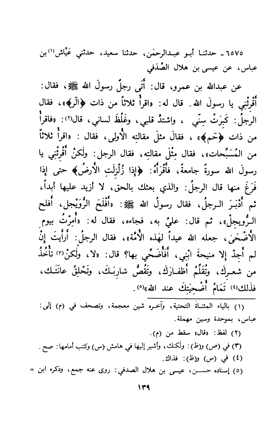 ٦٥٧٥ - حَدَّثَنَا أَبُو عَبْدِ الرَّحْمَنِ، حَدَّثَنَا سَعِيدٌ، حَدَّثَنِي عَيَّاشُ (١) بْنُ عَبَّاسٍ، عَنْ عِيسَى بْنِ هِلَالٍ الصَّدَفِيِّ، عَنْ عَبْدِ اللهِ بْنِ عَمْرٍو، قَالَ: أَتَى رَجُلٌ رَسُولَ اللهِ صَلَّى اللهُ عَلَيْهِ وَسَلَّمَ، فَقَالَ: " أَقْرِئْنِي يَا رَسُولَ اللهِ، قَالَ لَهُ: " اقْرَأْ ثَلَاثًا مِنْ ذَاتِ الر "، فَقَالَ الرَّجُلُ: كَبِرَتْ سِنِّي، وَاشْتَدَّ قَلْبِي، وَغَلُظَ لِسَانِي، قَالَ (٢) : " فَاقْرَأْ مِنْ ذَاتِ حم " فَقَالَ: مِثْلَ مَقَالَتِهِ الْأُولَى، فَقَالَ: " اقْرَأْ ثَلَاثًا مِنَ الْمُسَبِّحَاتِ "، فَقَالَ: مِثْلَ مَقَالَتِهِ، فَقَالَ الرَّجُلُ: وَلَكِنْ أَقْرِئْنِي يَا رَسُولَ اللهِ سُورَةً جَامِعَةً فَأَقْرَأَهُ: إِذَا زُلْزِلَتِ الْأَرْضُ حَتَّى إِذَا فَرَغَ مِنْهَا قَالَ الرَّجُلُ: وَالَّذِي بَعَثَكَ بِالْحَقِّ، لَا أَزِيدُ عَلَيْهَا أَبَدًا، ثُمَّ أَدْبَرَ الرَّجُلُ فَقَالَ رَسُولُ اللهِ صَلَّى اللهُ عَلَيْهِ وَسَلَّمَ: " أَفْلَحَ الرُّوَيْجِلُ، أَفْلَحَ الرُّوَيْجِلُ "، ثُمَّ قَالَ: عَلَيَّ بِهِ، فَجَاءَهُ، فَقَالَ لَهُ: " أُمِرْتُ بِيَوْمِ الْأَضْحَى، جَعَلَهُ اللهُ عِيدًا لِهَذِهِ الْأُمَّةِ "، فَقَالَ الرَّجُلُ: أَرَأَيْتَ إِنْ لَمْ أَجِدْ إِلَّا مَنِيحَةَ ابْنِي، أَفَأُضَحِّي بِهَا؟ قَالَ: " لَا، وَلَكِنْ (٣) تَأْخُذُ مِنْ شَعْرِكَ، وَتُقَلِّمُ أَظْفَارَكَ، وَتَقُصُّ شَارِبَكَ، وَتَحْلِقُ عَانَتَكَ، فَذَلِكَ (٤) تَمَامُ أُضْحِيَّتِكَ عِنْدَ اللهِ " (٥)