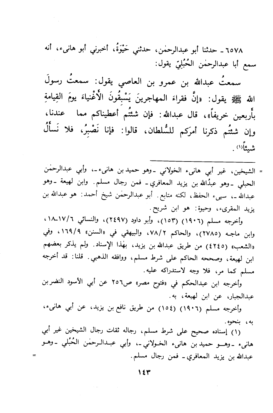 ٦٥٧٨ - حَدَّثَنَا أَبُو عَبْدِ الرَّحْمَنِ، حَدَّثَنَا حَيْوَةُ، أَخْبَرَنِي أَبُو هَانِئٍ، أَنَّهُ سَمِعَ أَبَا عَبْدِ الرَّحْمَنِ الْحُبُلِيَّ، يَقُولُ: سَمِعْتُ عَبْدَ اللهِ بْنَ عَمْرِو بْنِ الْعَاصِي، يَقُولُ: سَمِعْتُ رَسُولَ اللهِ صَلَّى اللهُ عَلَيْهِ وَسَلَّمَ يَقُولُ: " إِنَّ فُقَرَاءَ الْمُهَاجِرِينَ يَسْبِقُونَ الْأَغْنِيَاءَ يَوْمَ الْقِيَامَةِ بِأَرْبَعِينَ خَرِيفًا " قَالَ عَبْدُ اللهِ: " فَإِنْ شِئْتُمْ أَعْطَيْنَاكُمْ مِمَّا عِنْدَنَا، وَإِنْ شِئْتُمْ ذَكَرْنَا أَمْرَكُمْ لِلسُّلْطَانِ قَالُوا: فَإِنَّا نَصْبِرُ فَلَا نَسْأَلُ شَيْئًا " (١)