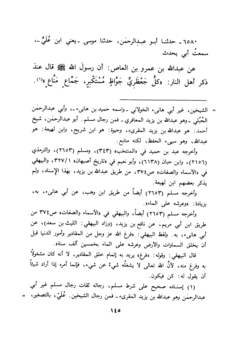 ٦٥٨٠ - حَدَّثَنَا أَبُو عَبْدِ الرَّحْمَنِ، حَدَّثَنَا مُوسَى يَعْنِي ابْنَ عَلِيٍّ، سَمِعْتُ أَبِي يُحَدِّثُ عَنْ عَبْدِ اللهِ بْنِ عَمْرِو بْنِ الْعَاصِي، أَنَّ رَسُولَ اللهِ صَلَّى اللهُ عَلَيْهِ وَسَلَّمَ قَالَ: " عِنْدَ ذِكْرِ أَهْلِ النَّارِ كُلُّ جَعْظَرِيٍّ جَوَّاظٍ مُسْتَكْبِرٍ جَمَّاعٍ مَنَّاعٍ " (١)